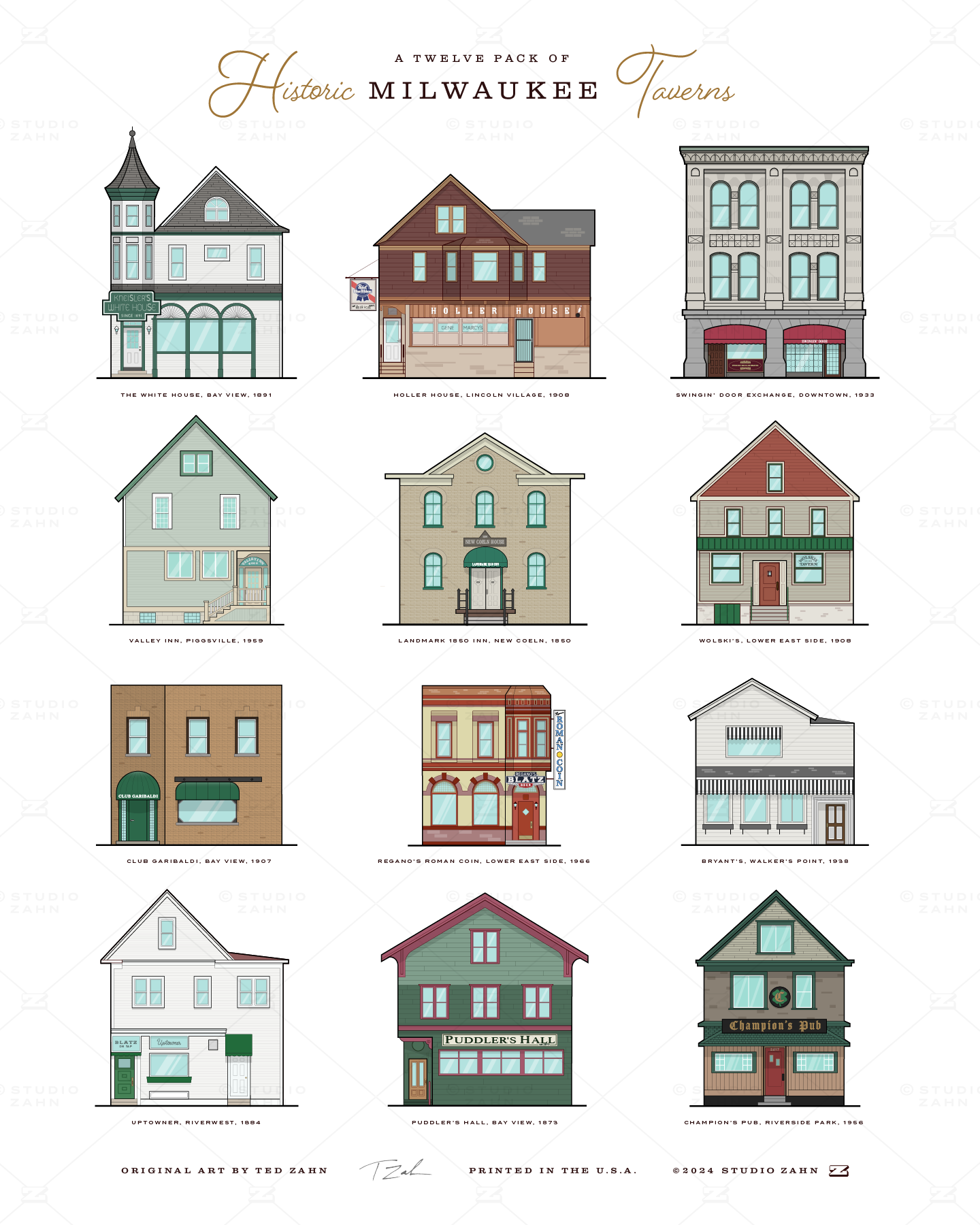 In a city renowned for beer, famous for its neighborhood taverns, this poster celebrates 12 of its most historic. Making cuts was not easy. There is no tavern on this poster less than 65 years old. That's a testament to the glorious tavern culture of my homeland, including such stalwarts as Wolski's, Holler House, Uptowner, Regano's, Bryant’s, and Puddler's Hall. Guaranteed to make a Milwaukeean both nostalgic and thirsty. Prost!!!