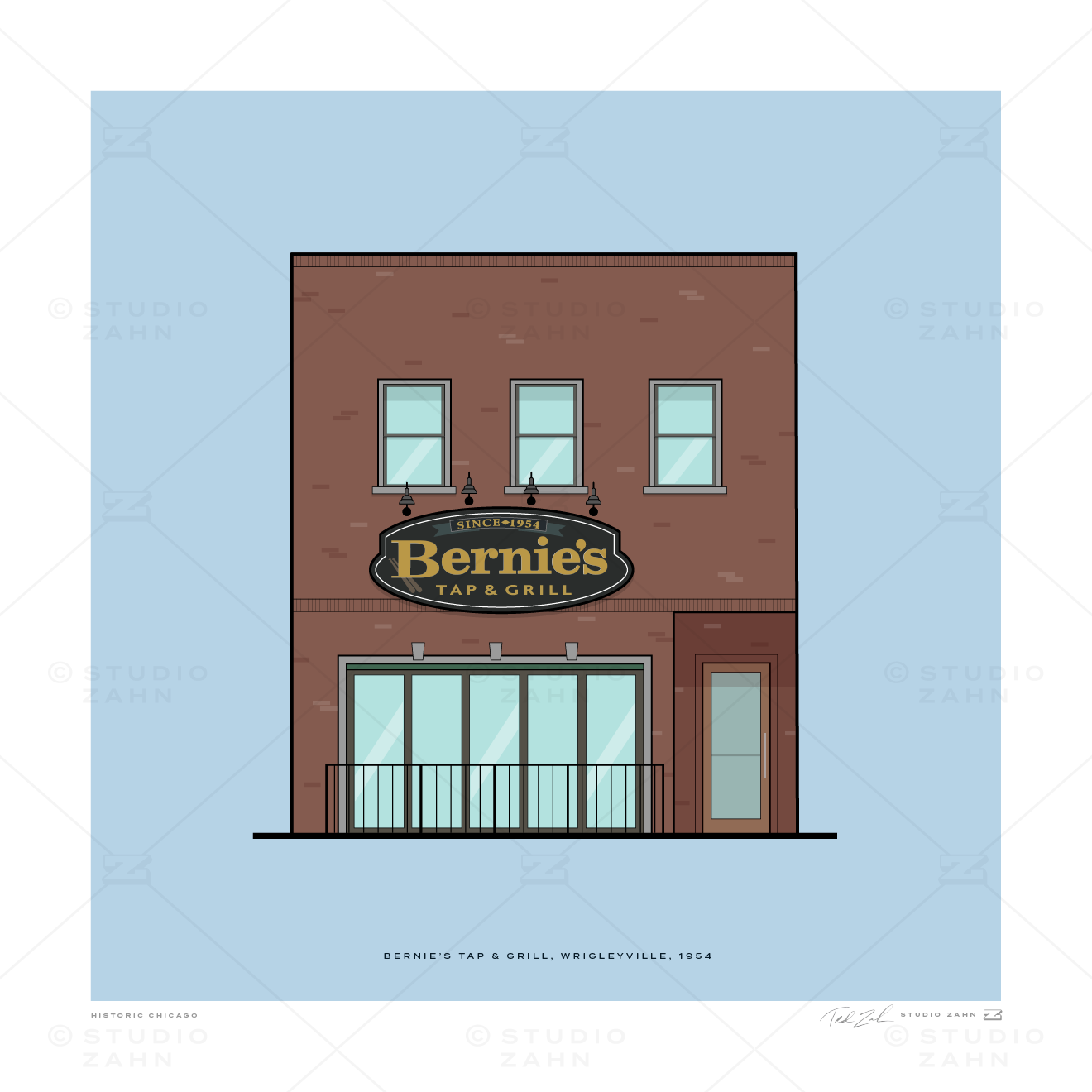 Art print of Bernie's Tap & Grill, the longtime pre- and postgame hangout for Cubs fans, in the shadow of Wrigley Field since 1954.