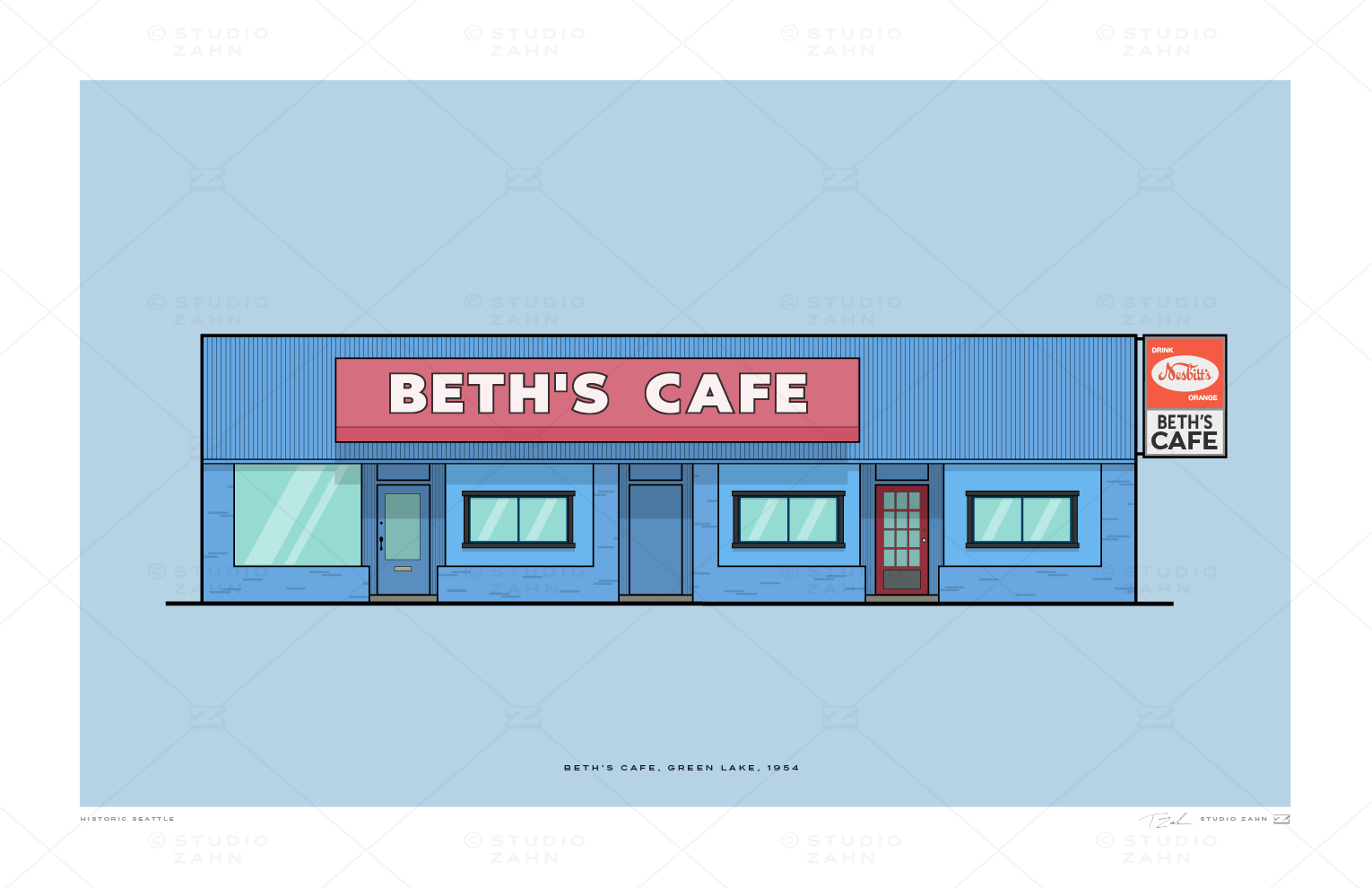 Art print of Beth's Cafe, the iconic eatery on Aurora Avenue North since 1954, famous for customer art on the walls, 12-egg omelettes, and all-you-can-eat hash browns.