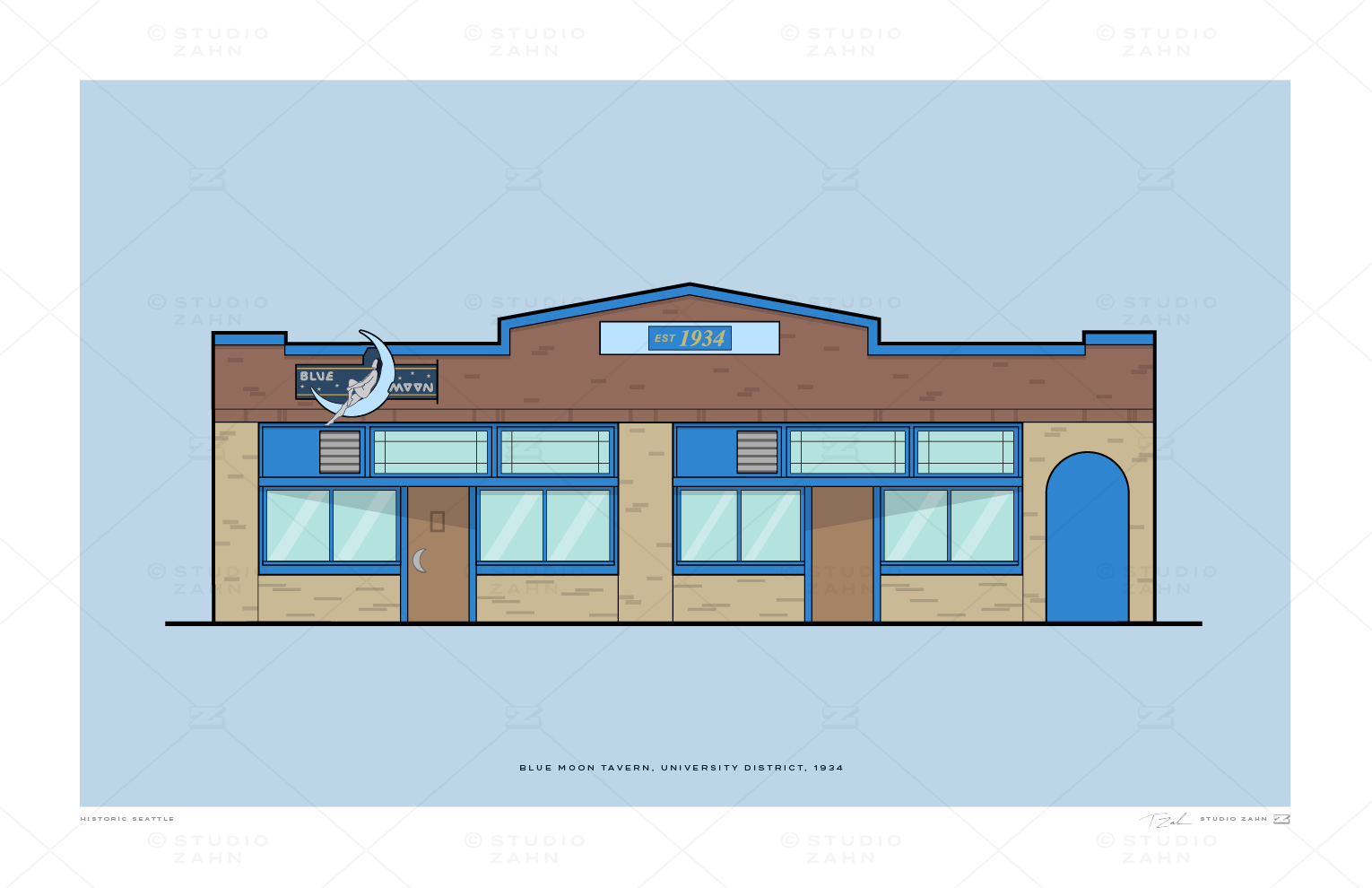 Art print of the Blue Moon Tavern, Seattle's "most infamous dive bar." Evolving with the times since 1934, it's gone through phases as a beatnik bar, biker bar, hippie bar, and grunge bar.