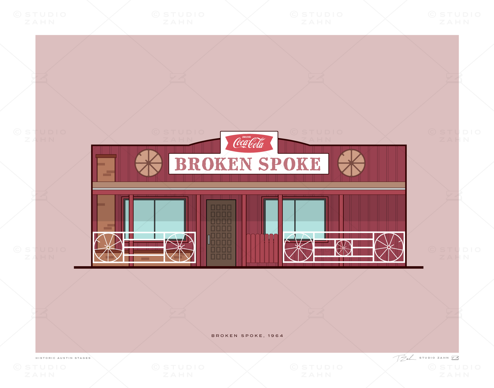Art print of the Broken Spoke, the iconic honky tonk and dance hall — opened and operated by the White family since 1964.