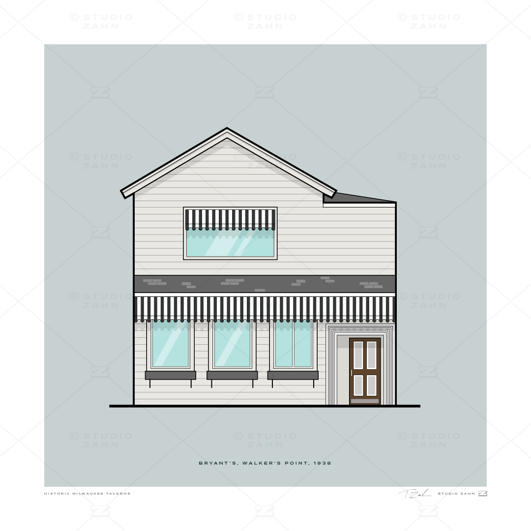 Art print of Bryant’s, which lays claim to being Milwaukee’s oldest cocktail lounge, opened in 1938 by mixologist Bryant Sharp—before mixology was even a thing.