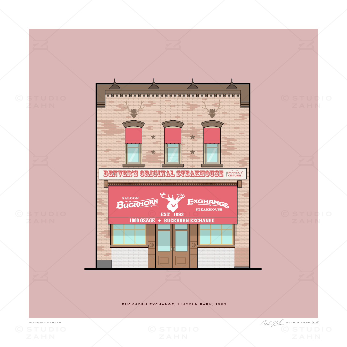 Art print of the Buckhorn Exchange, a Denver institution since 1893 ... member of the National Register of Historic Places, host to 5 presidents, and the city's oldest continuously-operating restaurant.