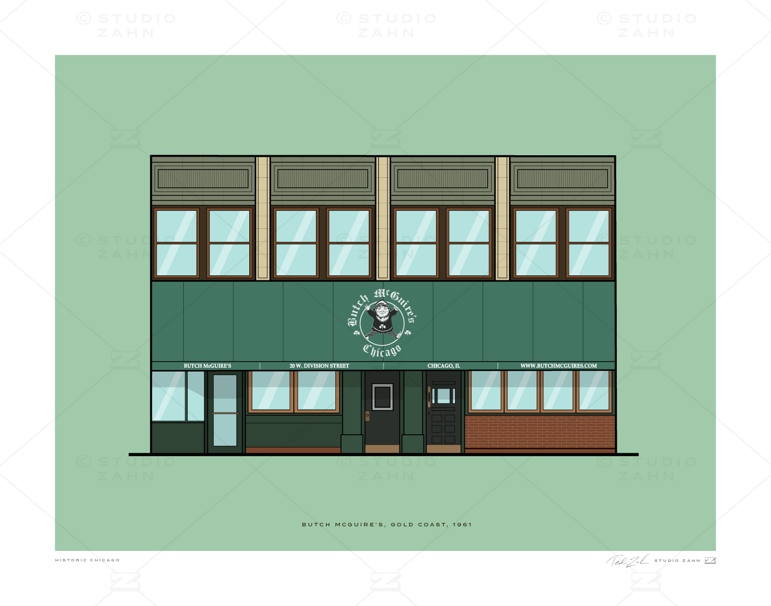 Art print of Butch McGuire's, the family-owned Division Street legend since 1961, famous for singles nights, Harvey Wallbangers, Christmas, and much more...