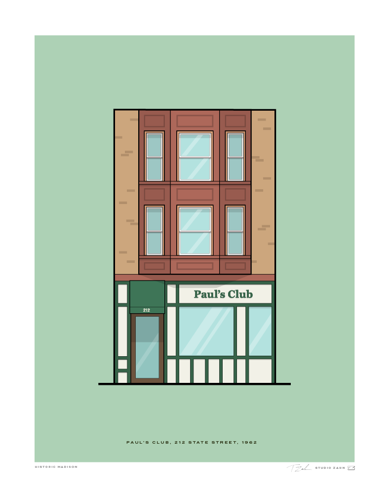Art print of the original 212 State Street location of Paul's Club, the landmark lounge with the iconic indoor tree.
