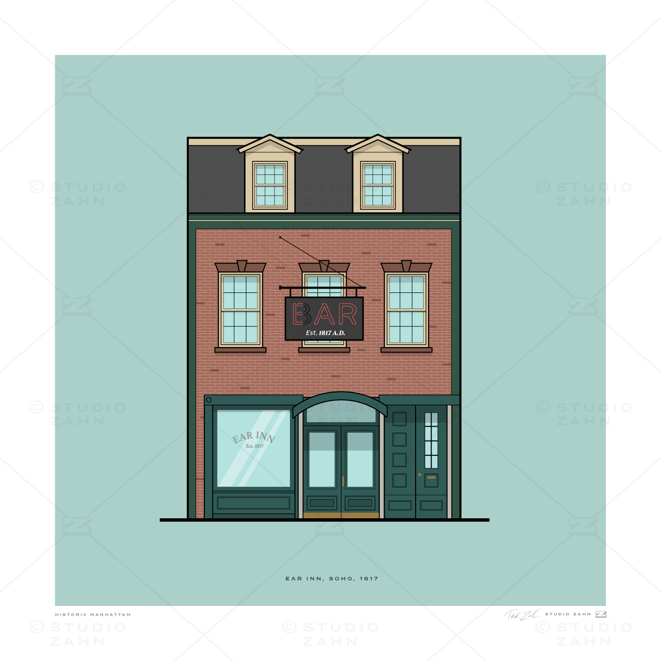 Art print of the Ear Inn (known as the Green Door prior) one of New York's oldest storefronts, dating to the 1770s and continuously operating as a tavern since 1817.