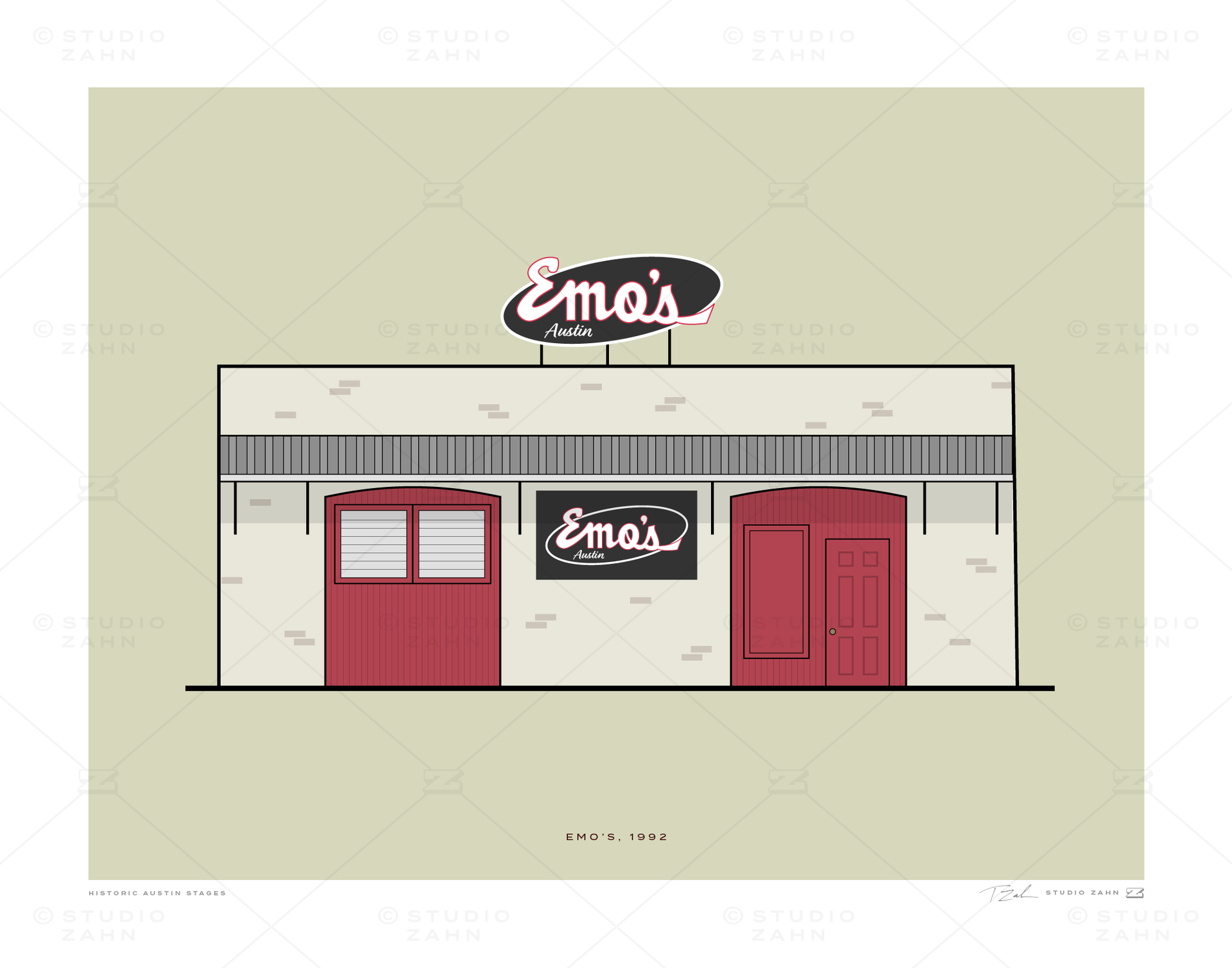 Art print of the original Red River Street location of Emo's, the legendary underground / punk venue.
