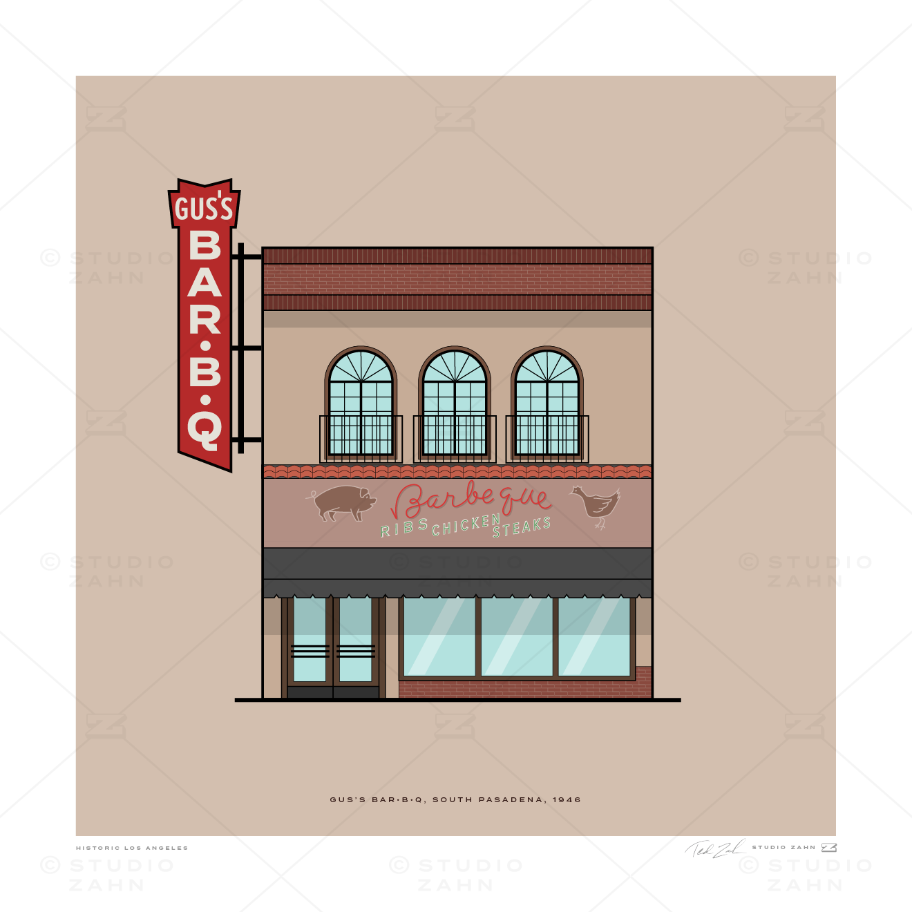 Art print of Gus's Barb-B-Q, the South Pasadena institution on Fair Oaks Ave — with the can't-miss neon 😍