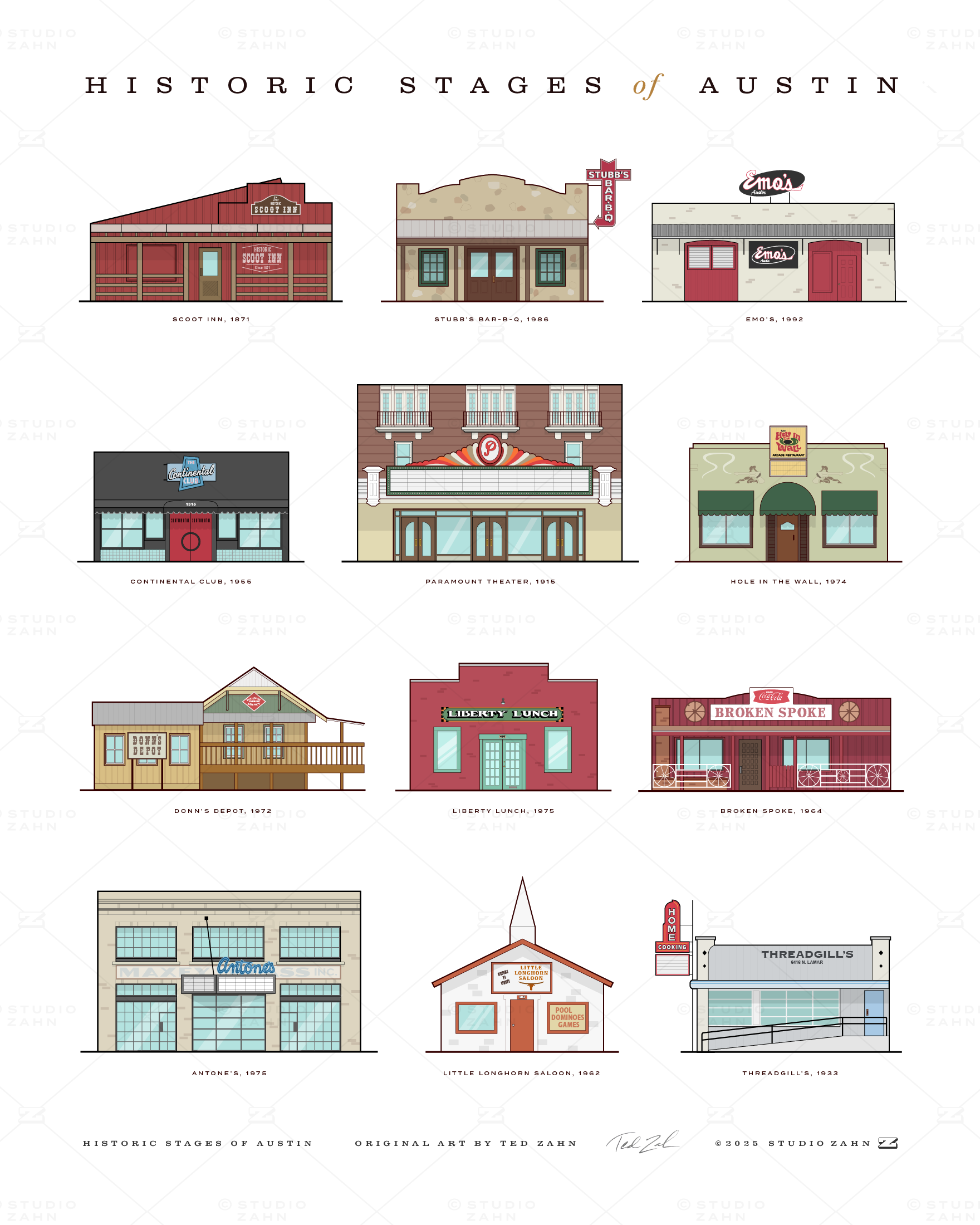 In a town renowned for its music, these joints supply the heartbeat. This is a 16" x 20" tribute to 12 of Austin's most iconic, historic, influential live music venues, including The Paramount, Antone's, Hole in the Wall, Donn's Depot and the Little Longhorn Saloon. Put a little music history on your wall!