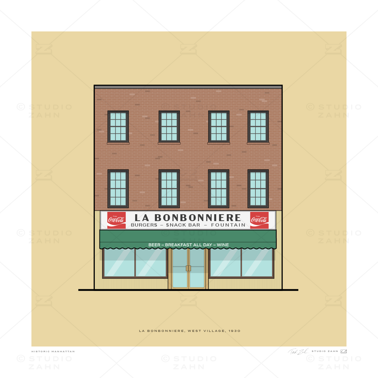 Art print of La Bonbonniere, the classic diner and lunch counter in the West Village since 1930.