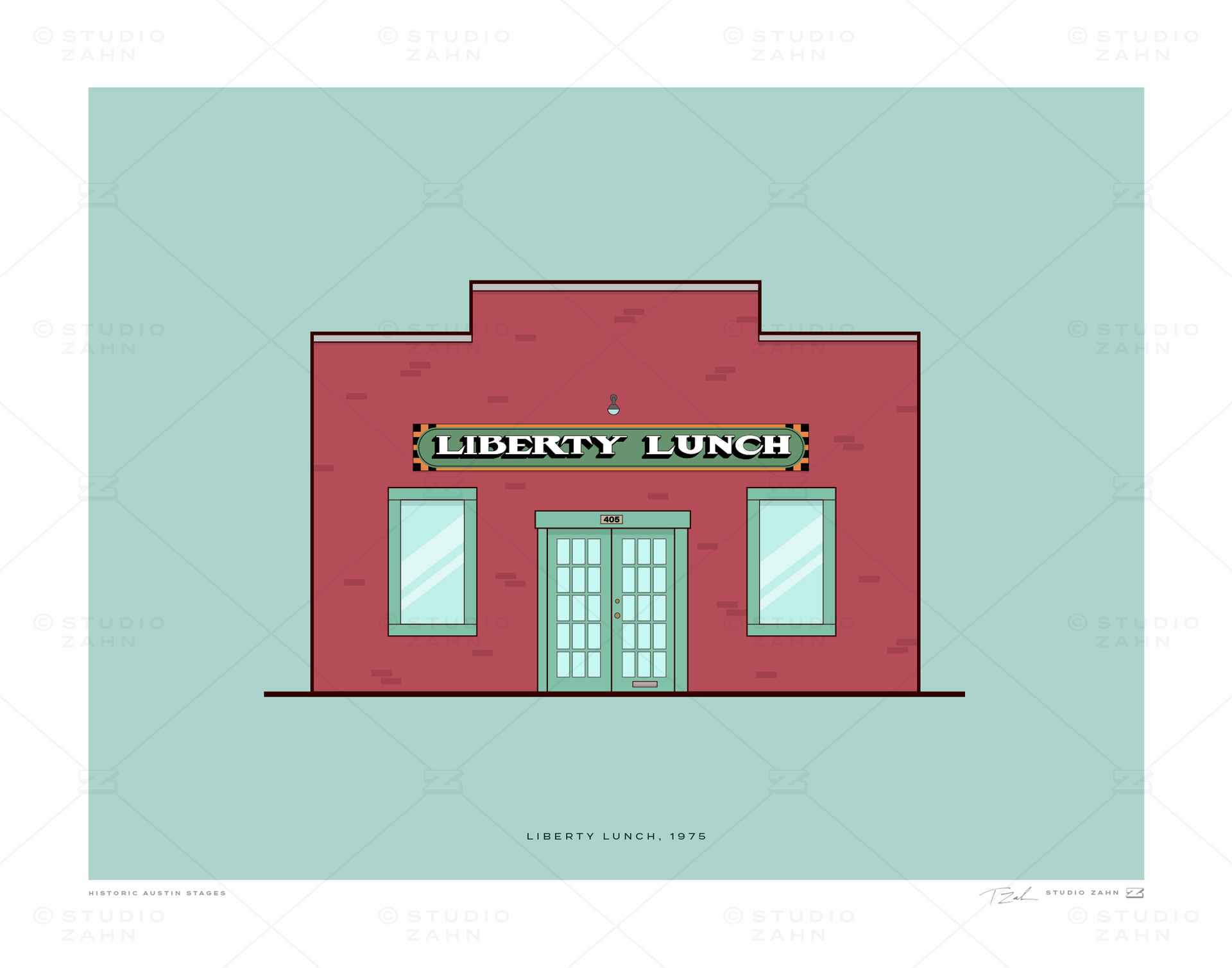 Art print of the W. Second Street landmark Liberty Lunch, lost in 1999 after a legendary 25-year run that saw it play host to practically everyone who mattered during the era, from Nirvana to Dolly Parton to Sonic Youth to George Clinton.