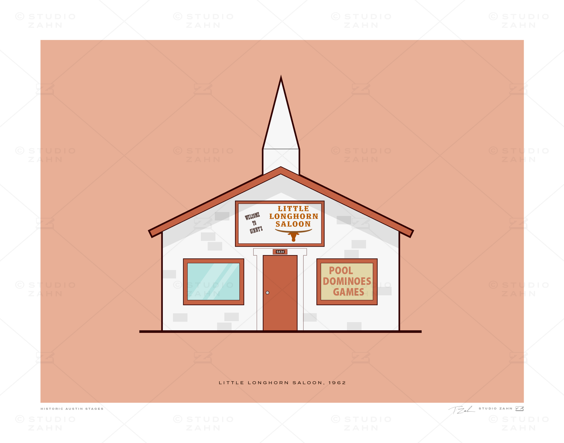 Art print of the Little Longhorn Saloon, the classic Burnet Road honky tonk dive (and home to Chicken Sh*t Bingo) since 1962.