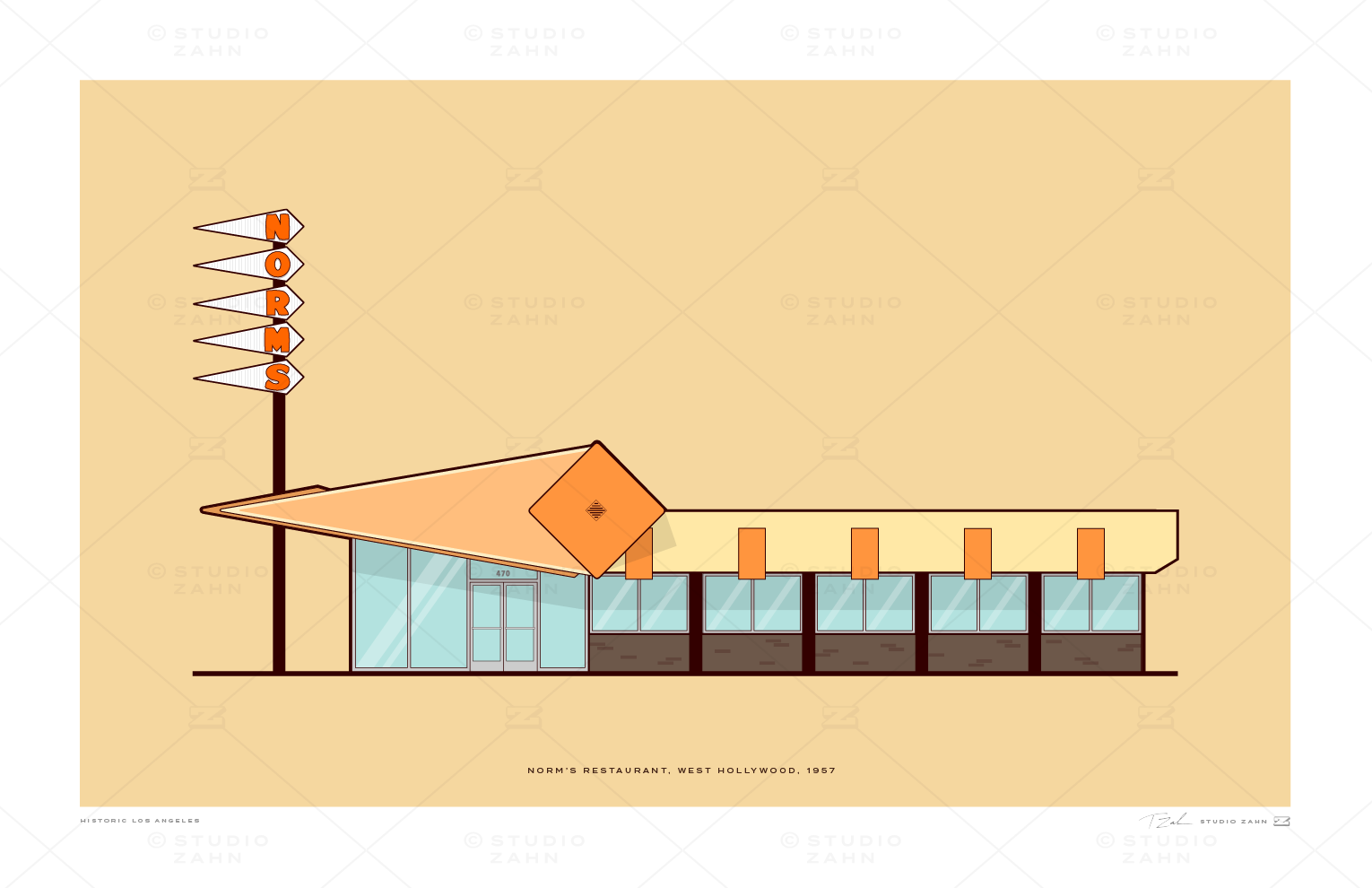 Art print of Norm's Restaurant on La Cienega, the oldest surviving restaurant of the iconic LA chain, built in 1957.