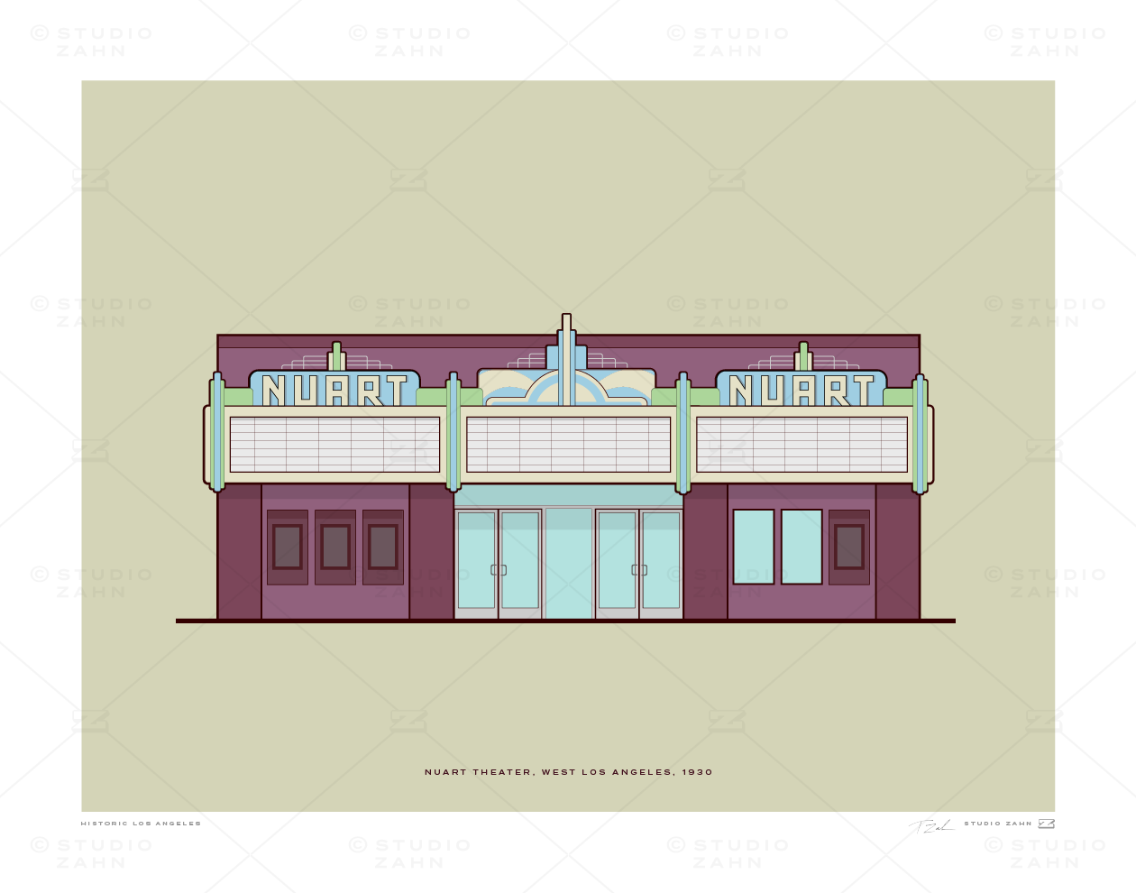 Art print of the historic Nuart Theater, opened in West Los Angeles in 1930.