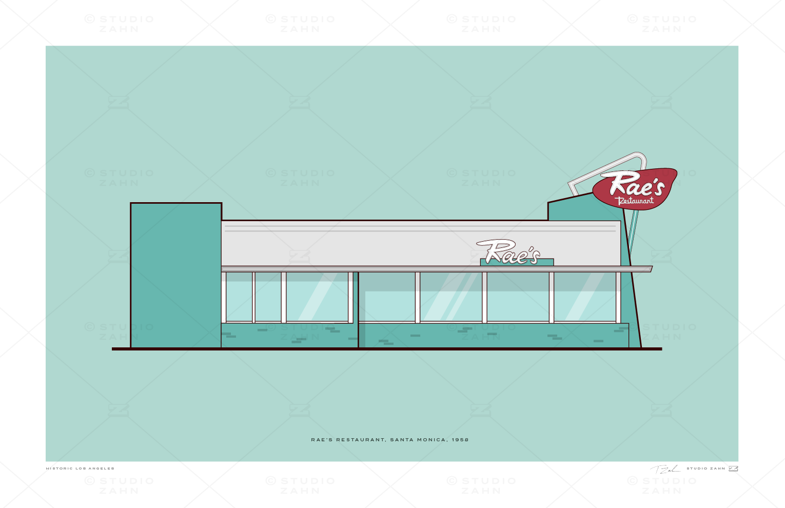 Art print of Rae’s Restaurant, the Santa Monica institution for more than 60 years.