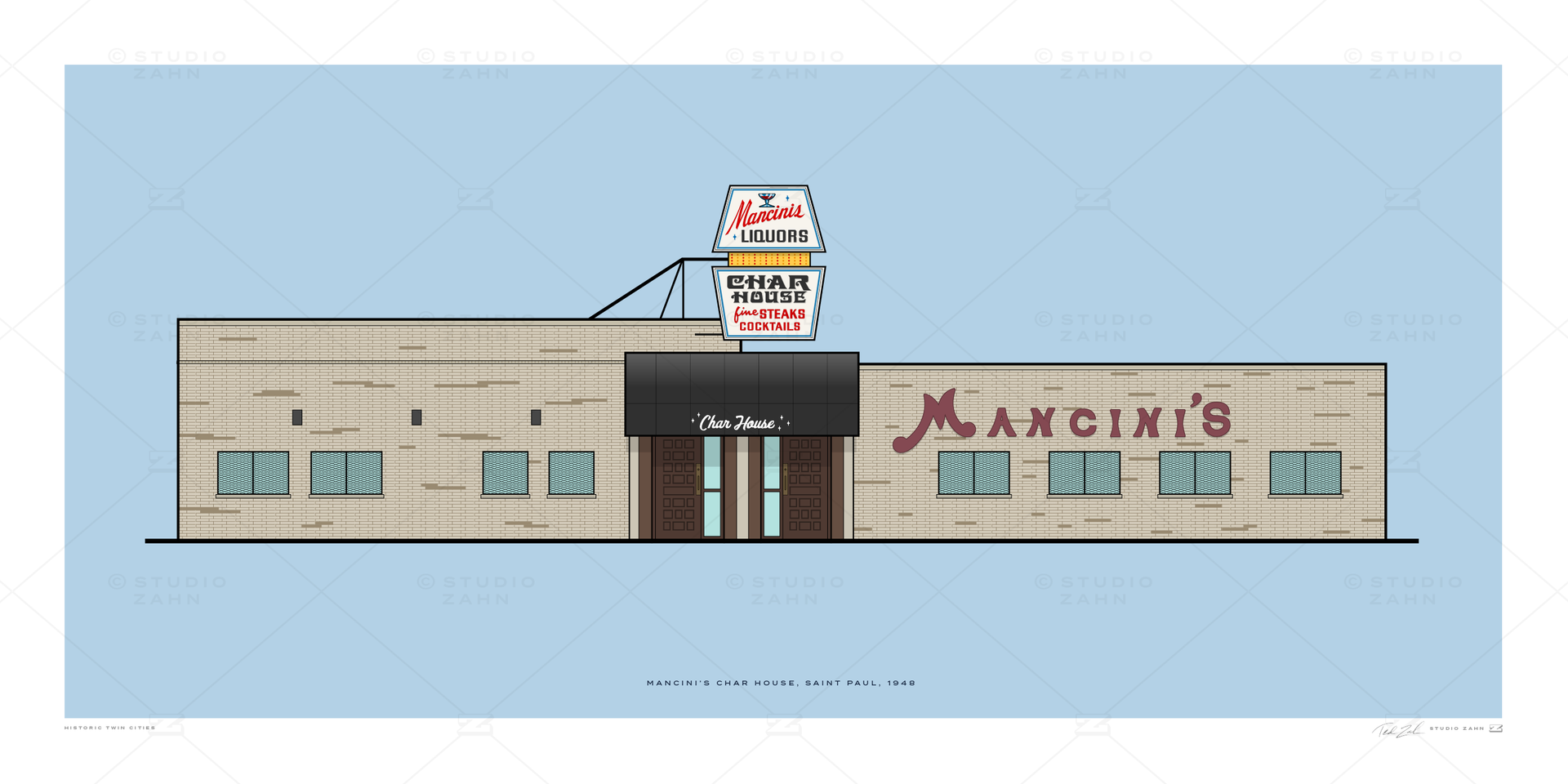 Art print of Mancini's Char House, Saint Paul's legendary steakhouse, bar, and music venue, family-owned for 4 generations since 1948.