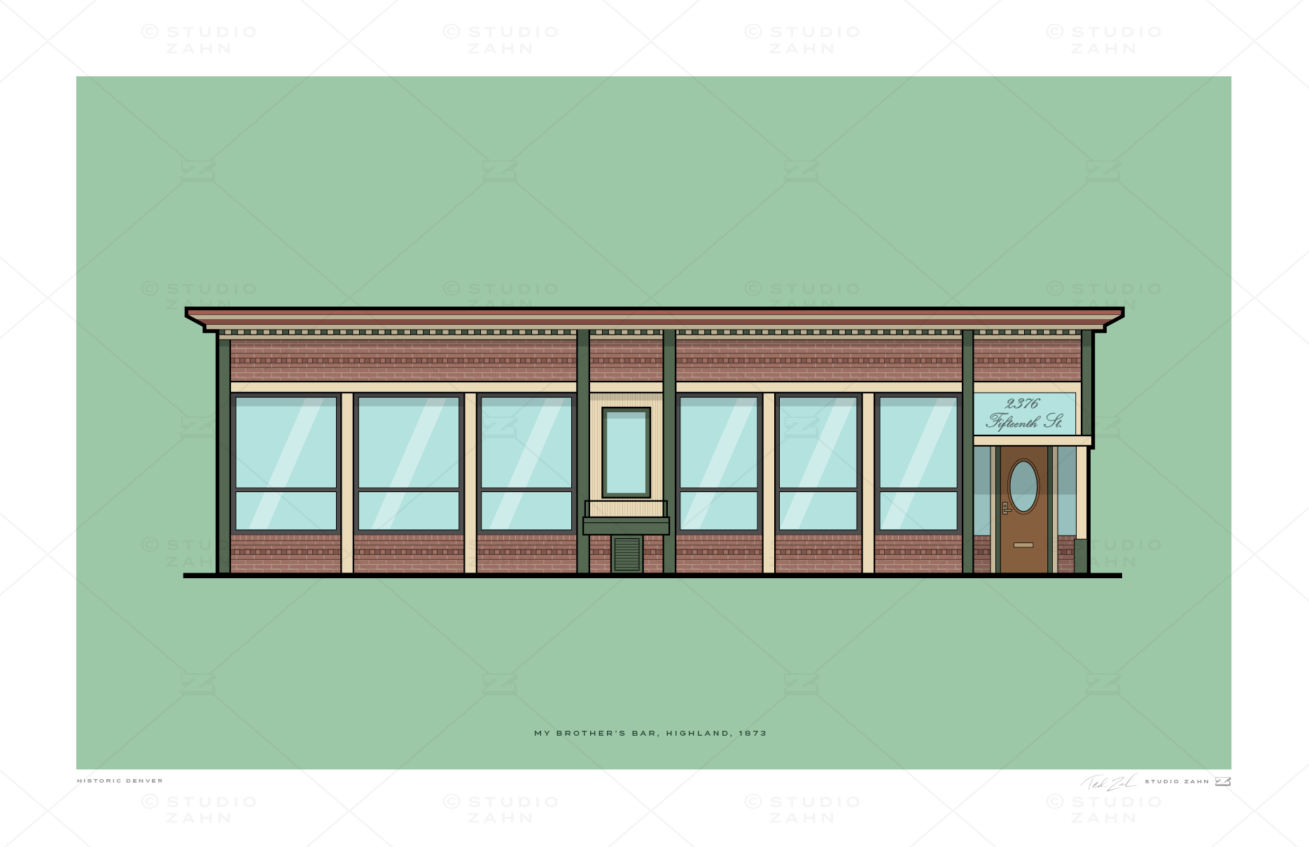 Art print of My Brother's Bar, the iconic pub and burger joint — and the oldest watering hole in Denver, dating to 1873 when it opened as the Highland House.