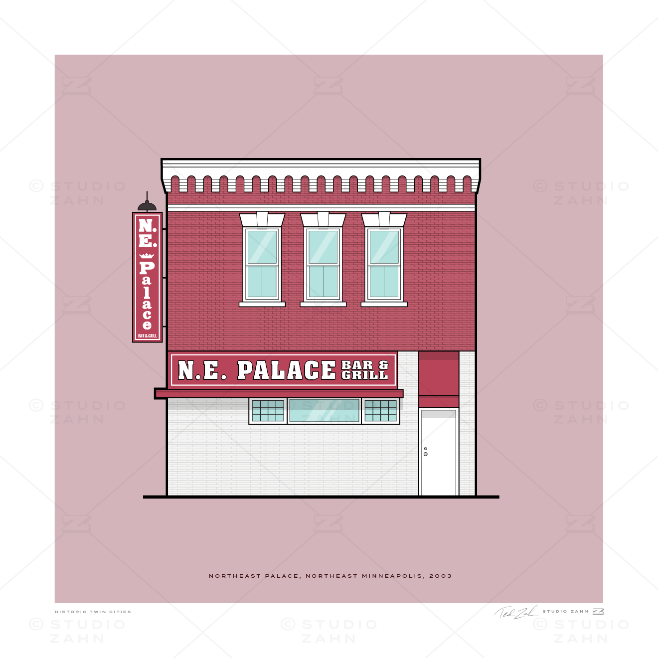 Art print of the Northeast Palace, the big red dive / music venue / karaoke joint on 4th and Lowry dating to 2003 ... prior to that known as the First Chance / Last Chance Bar.