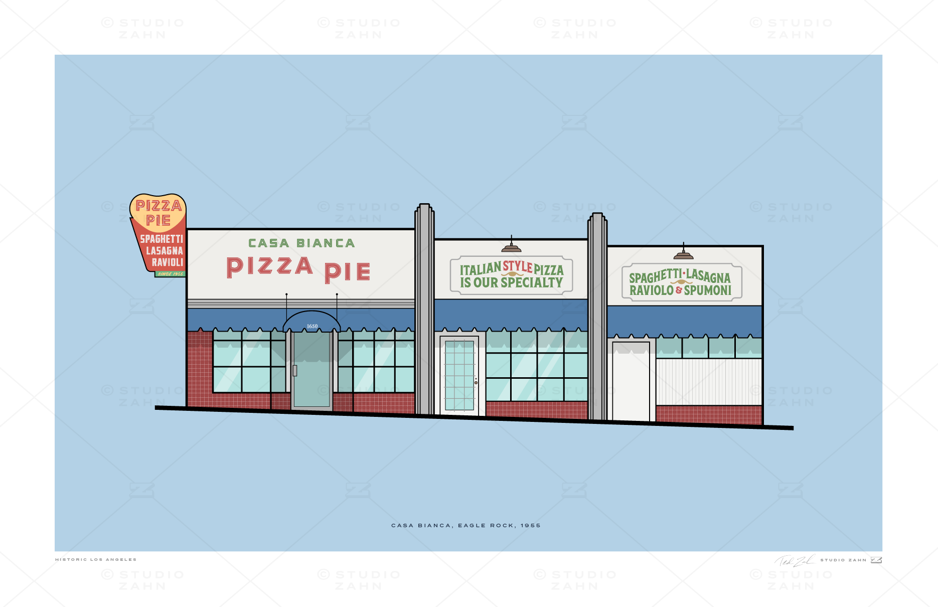 Art print of Casa Bianca, the Eagle Rock mainstay for pizza, lasagna and other Italian specialties since 1955