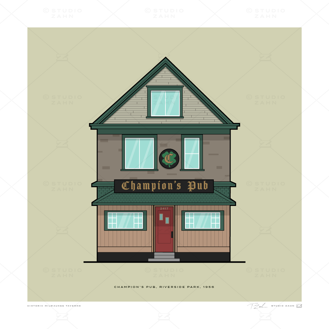 Art print of Champion's Pub, the venerable East Side hangout dating to 1956 — third-generation family-owned by the Champion/Greenya clan!