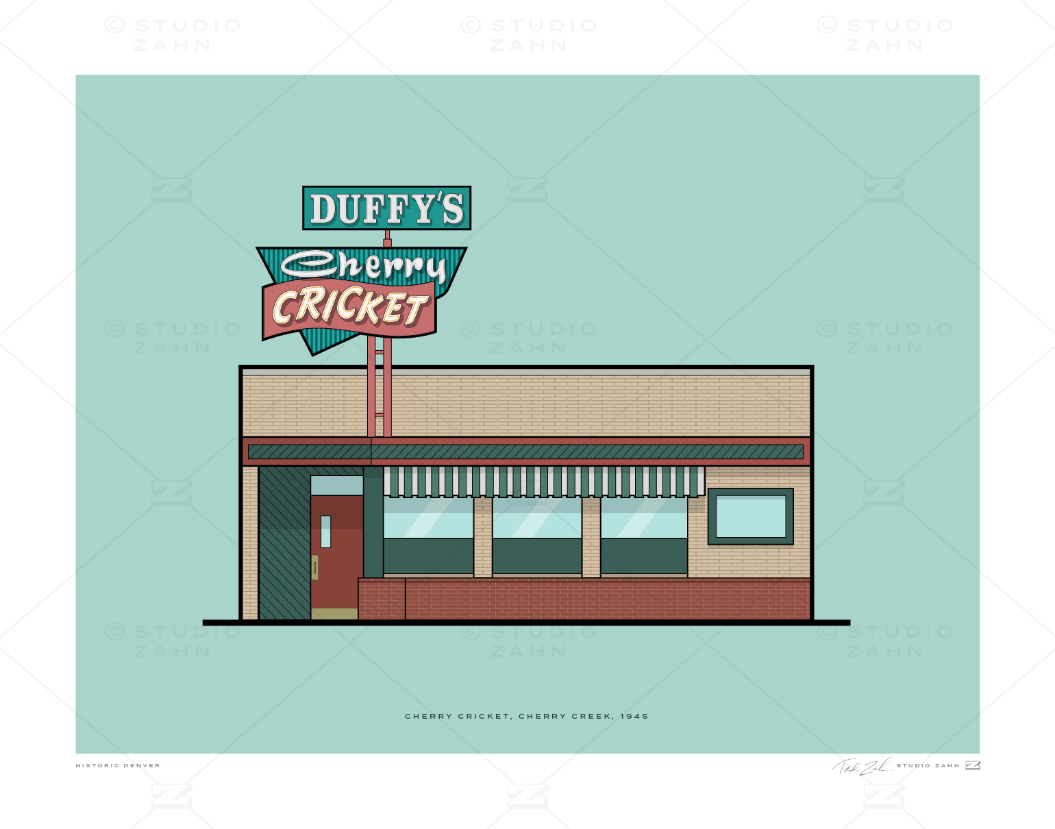 Art print of the Cherry Cricket, the Cherry Creek institution — famous for it burgers —since 1945.