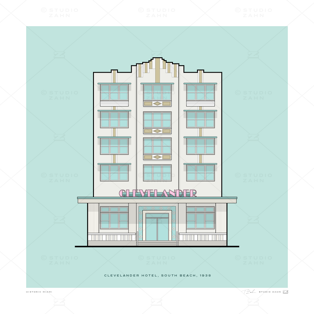 Art print of the Clevelander Hotel, the South Beach Art Deco landmark opened in 1938.