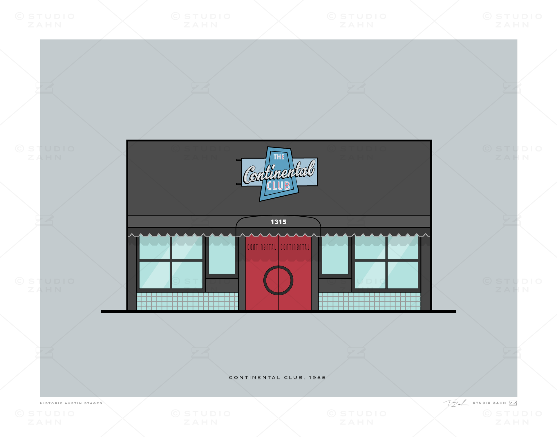 Art print of the iconic Continental Club, a Congress Avenue mainstay since 1955 and one of the oldest continuously-operating clubs in Austin.