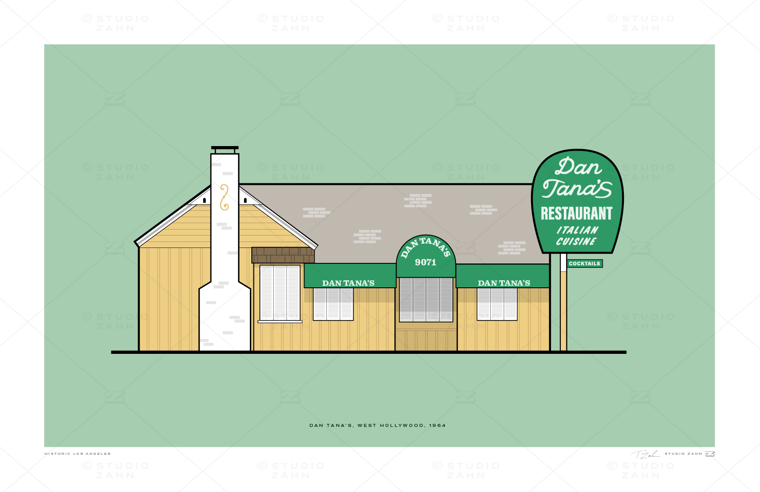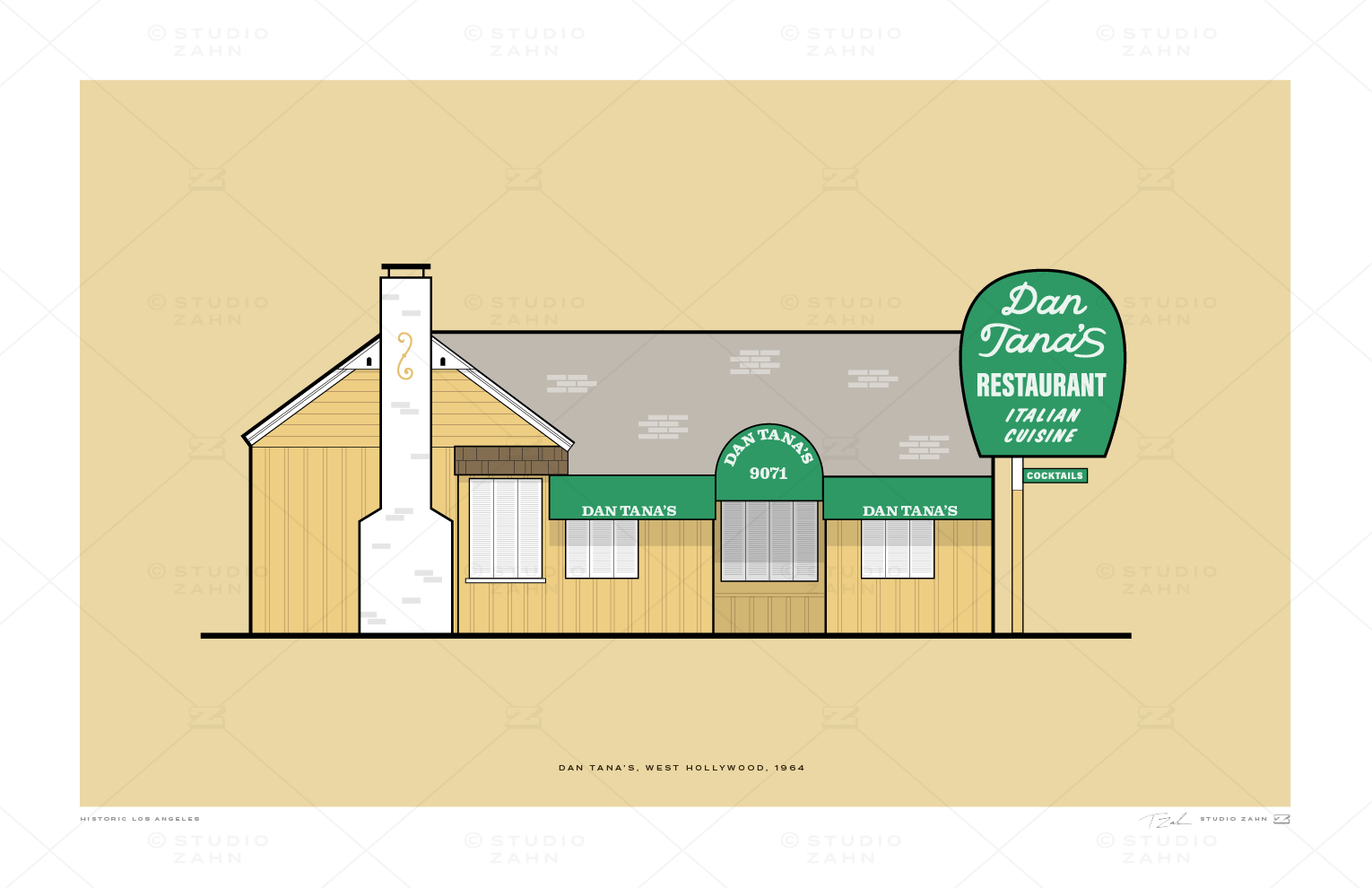 Art print of Dan Tana's Restaurant, the star-studded West Hollywood eatery and bar opened in 1964.