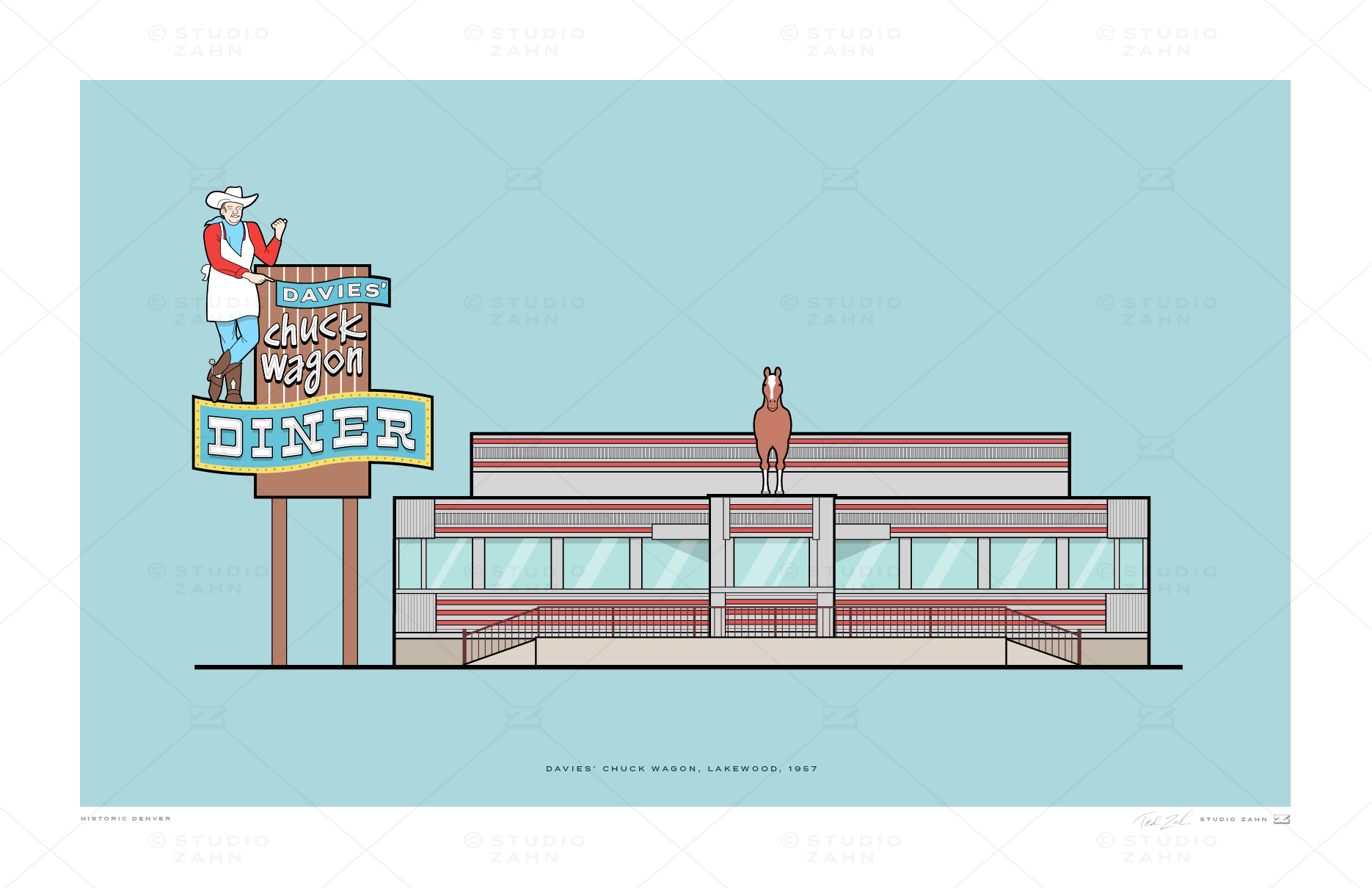 Art print of Davies' Chuck Wagon diner, the landmark 1957 diner with the can't-miss neon sign.