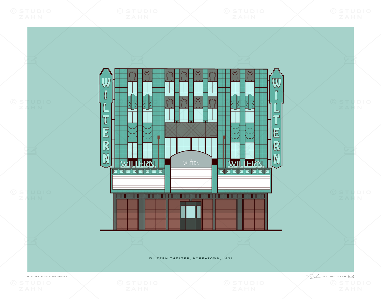 Art print of the Wiltern Theater, the Art Deco landmark opened in 1931 at the corner of Wilshire and Western (hence Wiltern).