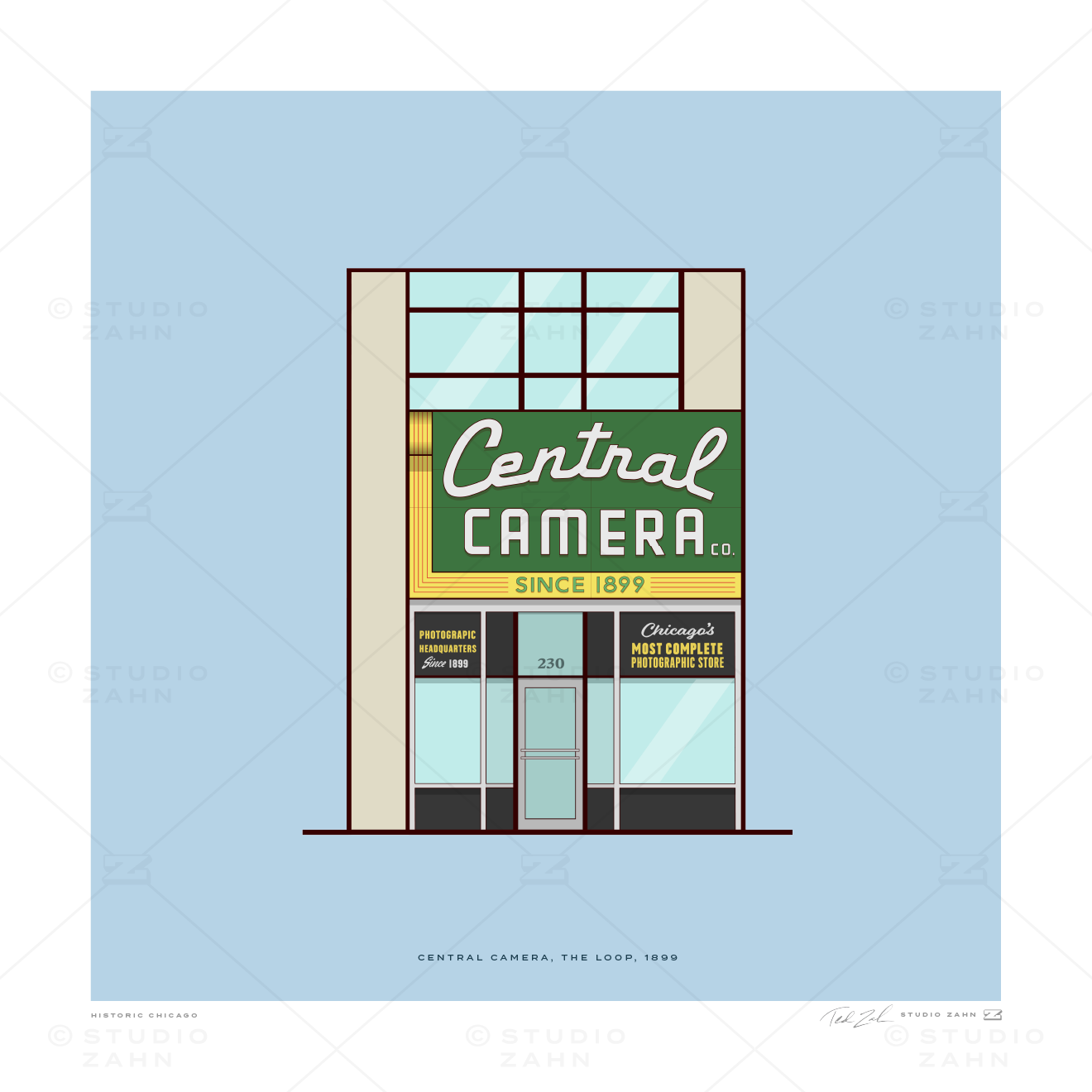 Art print of Central Camera, the historic fixture with the iconic signage, on The Loop since 1899.