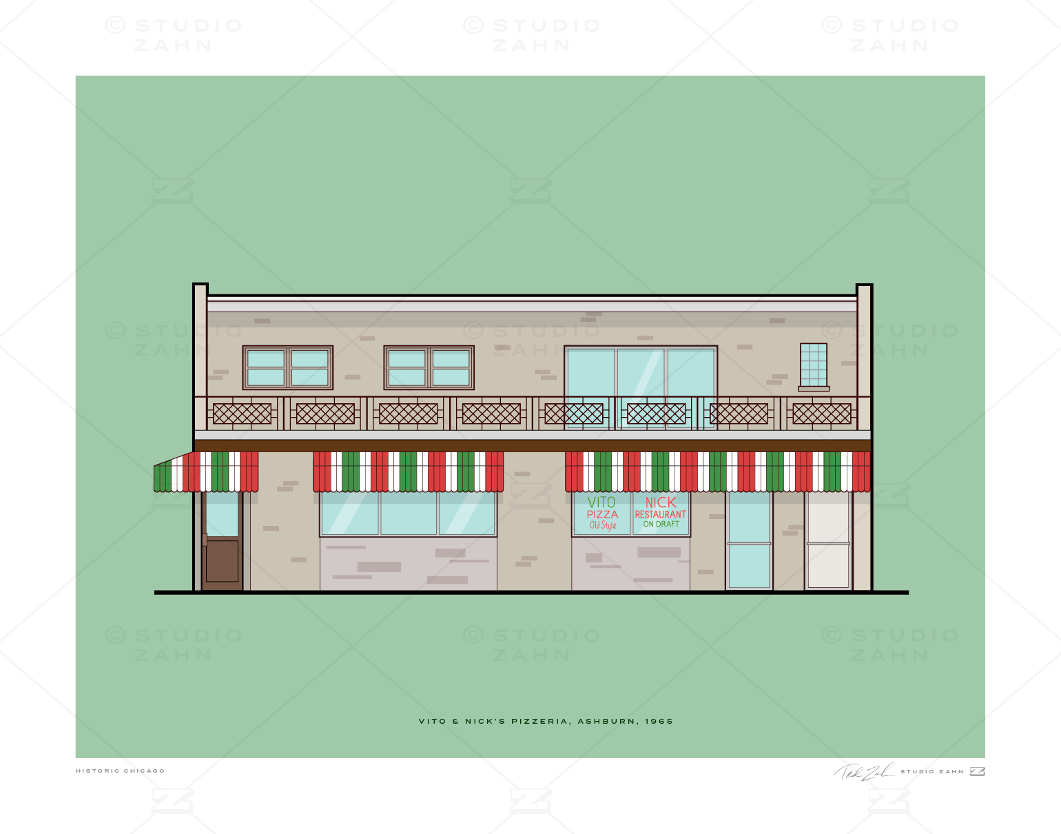 Art print of the Vito & Nick's, the Ashburn neighborhood mainstay serving up famous thin crust pies since 1956.