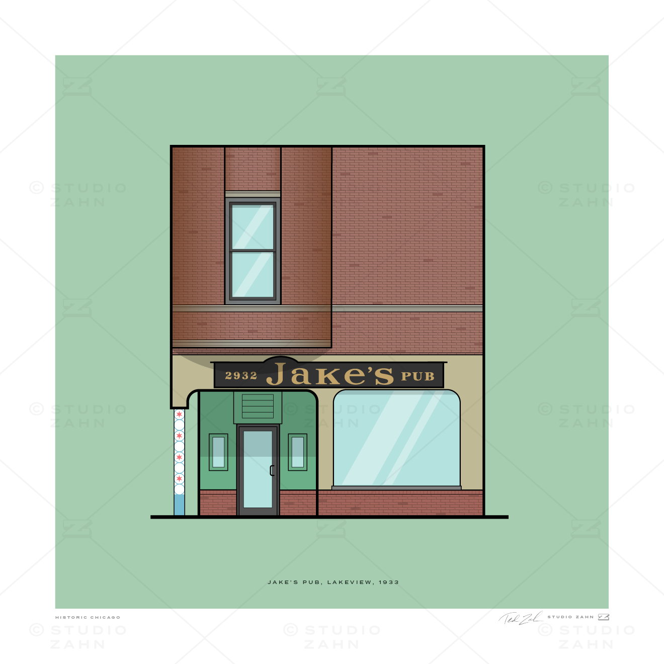 Art print of Jake's Pub, the North Clark Street corner bar dating back to the repeal of Prohibition in 1933.
