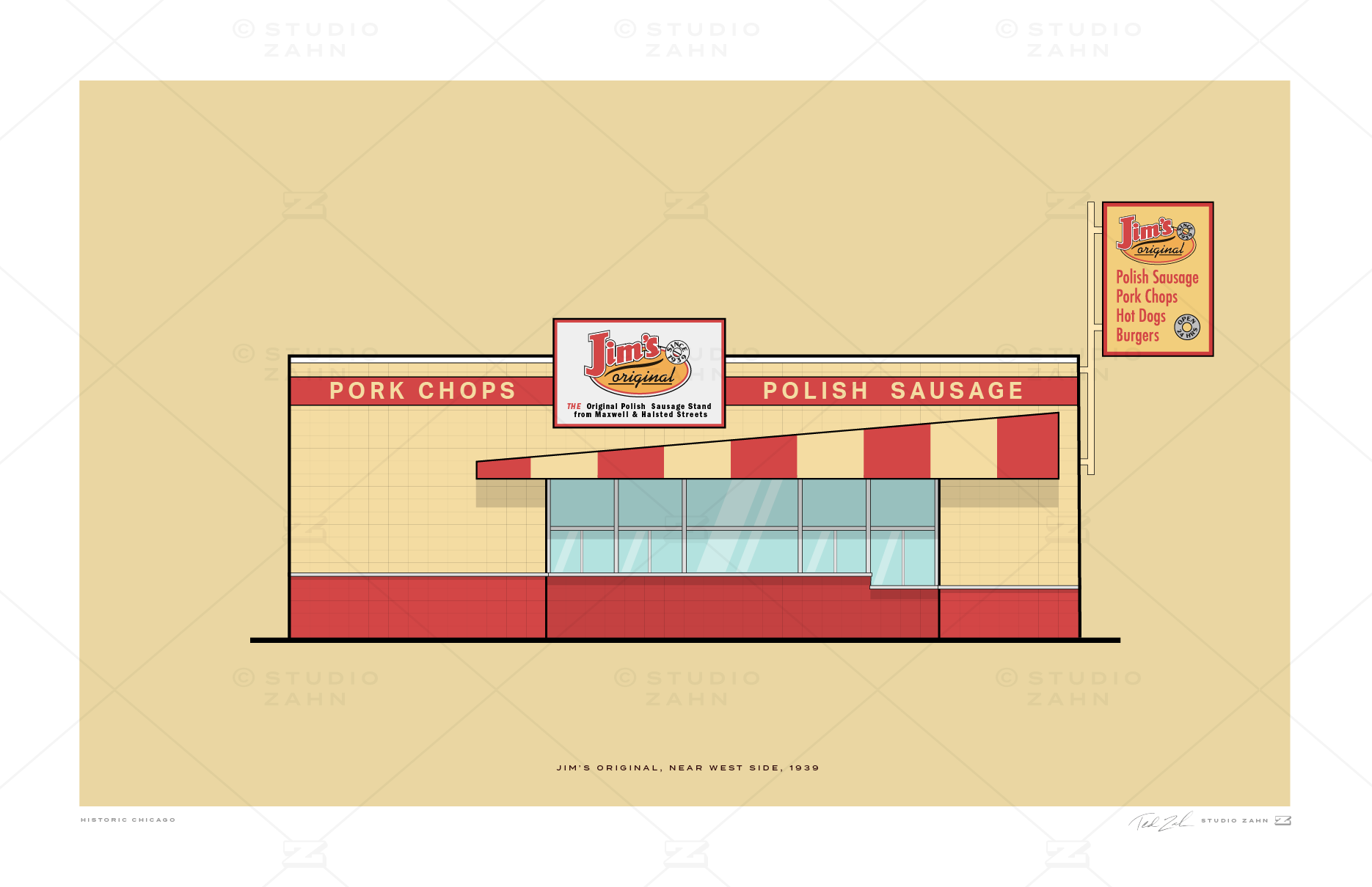 Art print of Jim's Original, home of the Original Maxwell Street Polish Sausage—and all the delicious meats—since 1939.
