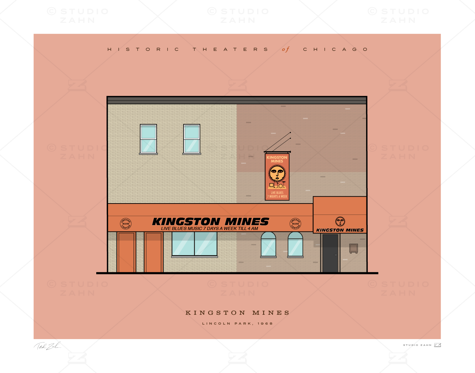 Art print of Kingston Mines, the legendary blues venue and longest continuously-operating blues club in Chicago. “Hear Blues, Drink Booze, Talk Loud, You’re Among Friends!”