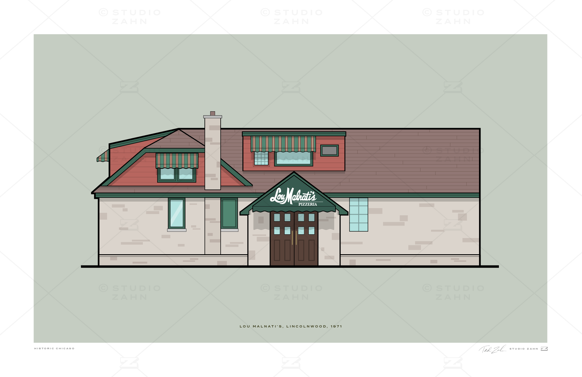 Art print of the original Lincolnwood location of Lou Malnati's, a deep dish pioneer in Chicagoland — and home of the signature Buttercrust.