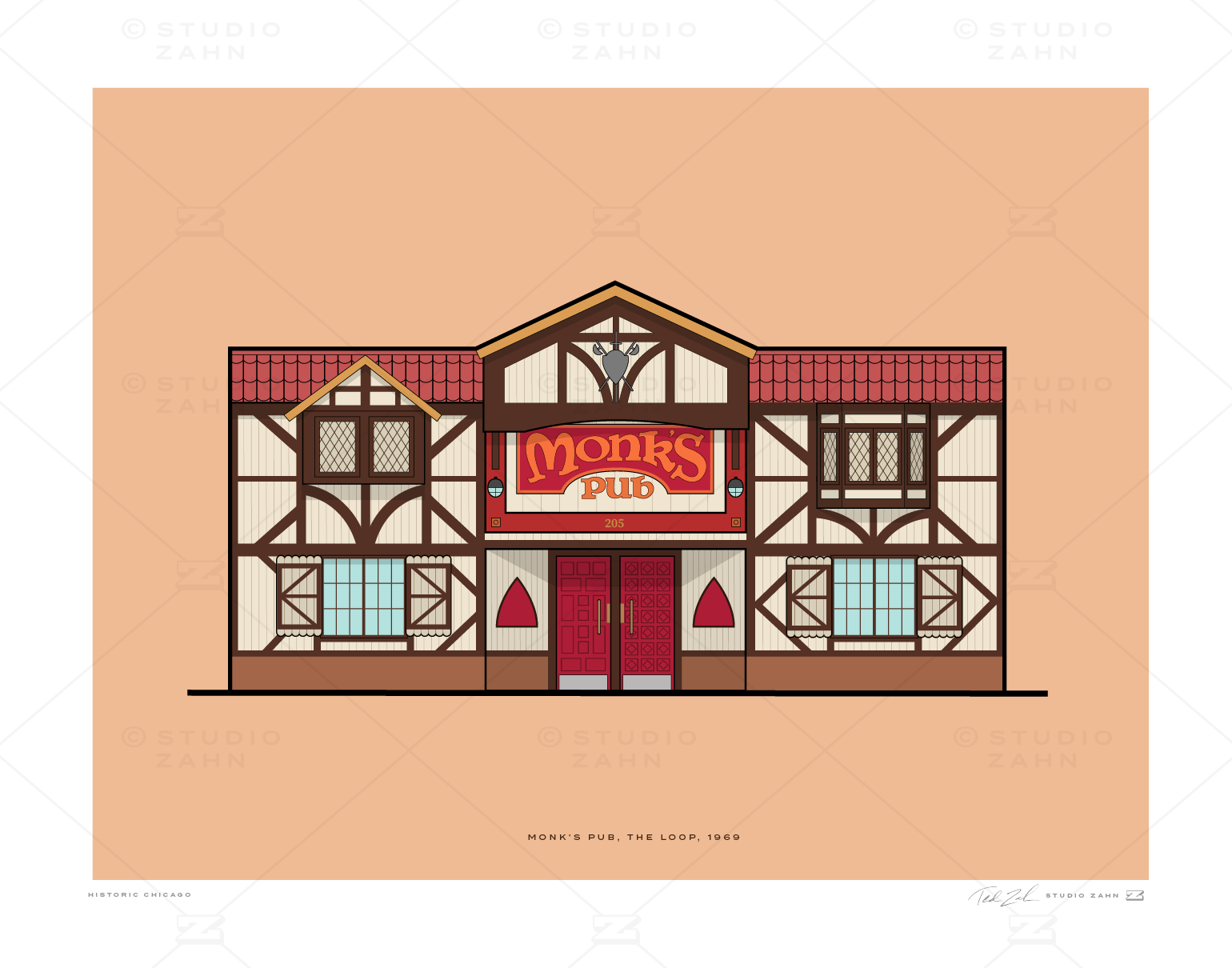 Art print of Monk's Pub, a little taste of Belgium in the heart of the Loop since 1969.