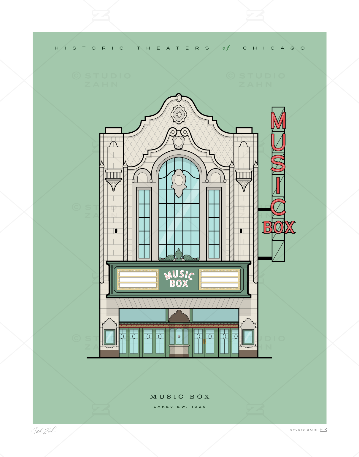 Art print of the Music Box Theatre, the beloved Lakeview venue and home to indie, foreign and classic cinema. The theater was designed by architect Louis Simon in the Spanish Baroque Revival style, opening in 1929 as a live performance and vaudeville house. In 1987, the Music Box was designated a Chicago Landmark, and it lives on as a beacon of light for Chicago's cinephile community.
