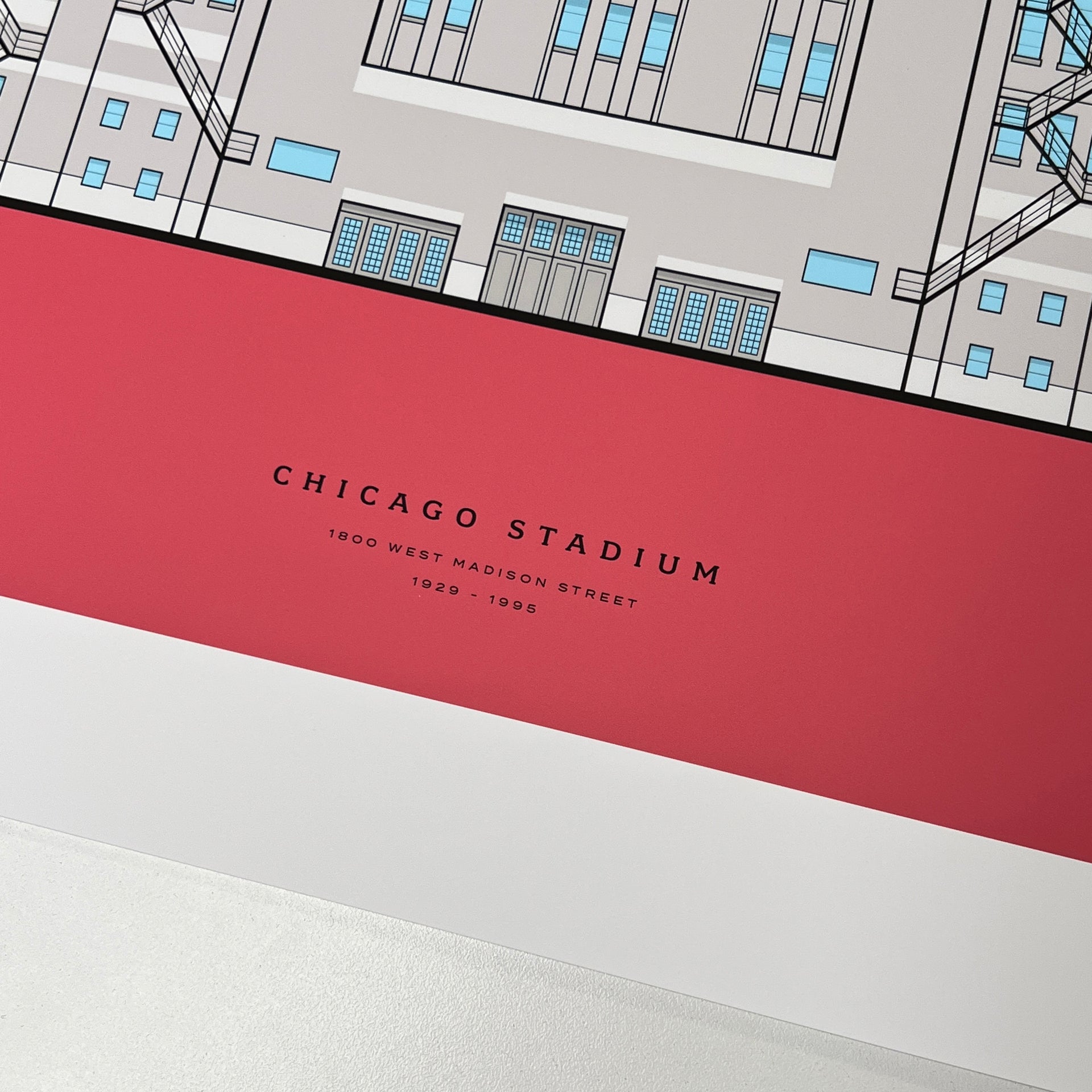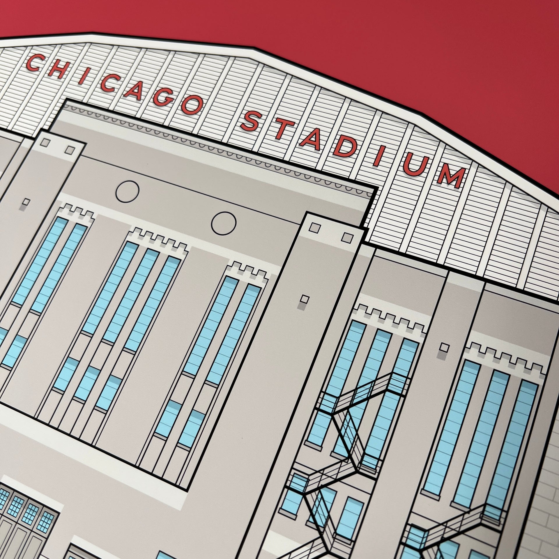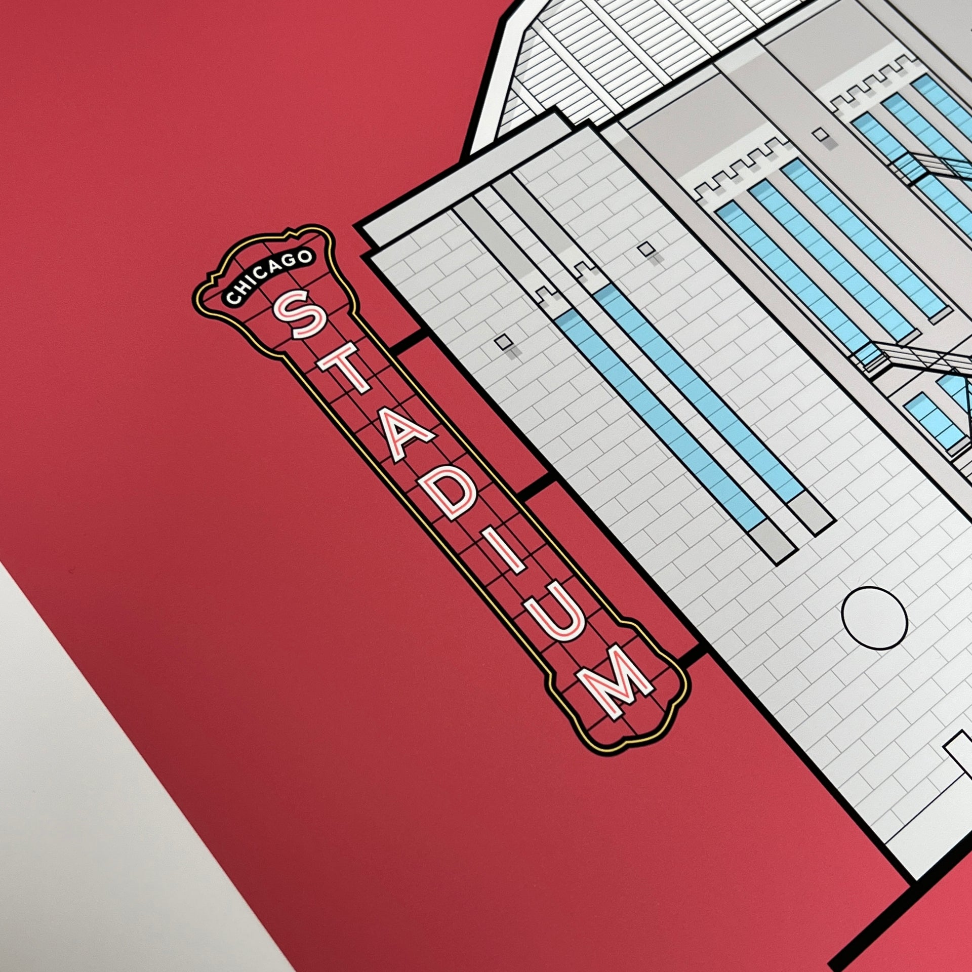 Art print of the iconic "Madhouse on Madison," the old Chicago Stadium: beloved home to the Chicago Bulls, Blackhawks, political conventions, and a who's who of concerts including Elvis, Michael Jackson, Frank Sinatra and Paul McCartney. Featuring the brilliant red of the both the Bulls and Blackhawks, this print pays homage to this historic architectural gem in all its glorious detail.
