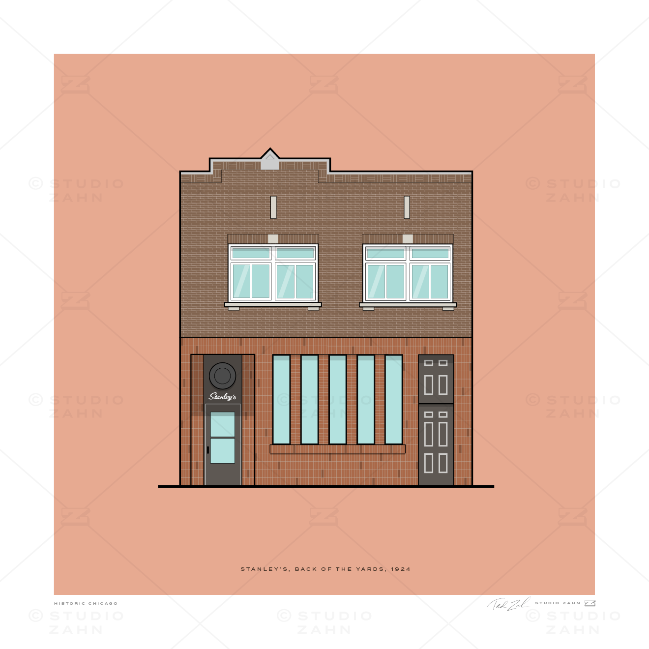 Art print of Stanley's, the Ashland Avenue institution since 1924 ... the last remaining bar from the famed "Whiskey Row," and a longtime working man's eatery and watering hole for stockyard employees.