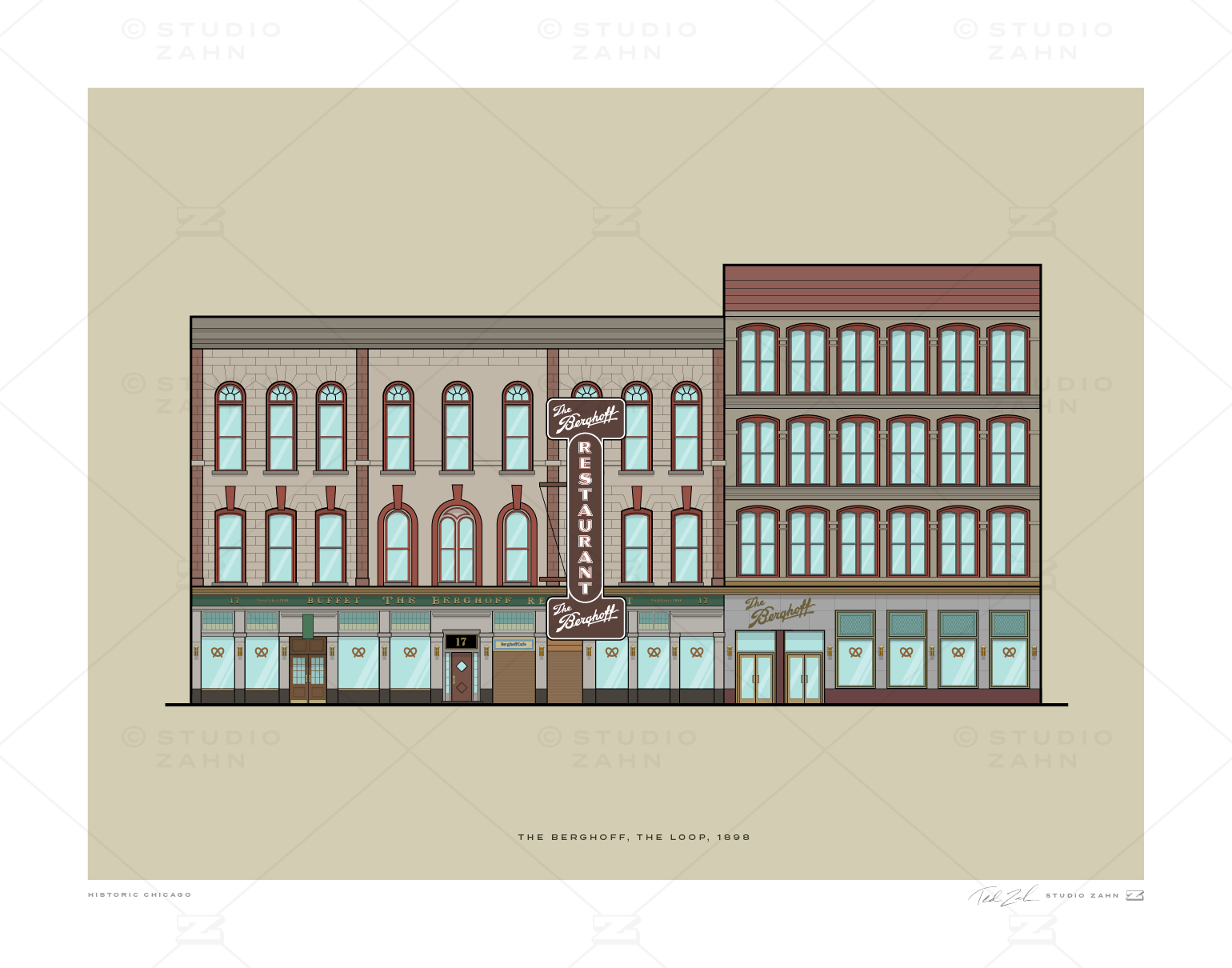 Art print of the Loop icon The Berghoff, the Bavarian-inspired, family-owned 45,000 sq. foot, bar, cafe, and restaurant for more than 125 years.