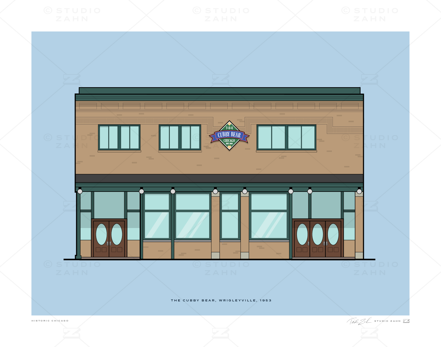 Art print of The Cubby Bear, the beloved gameday institution in the shadow of Wrigley Field since 1953.