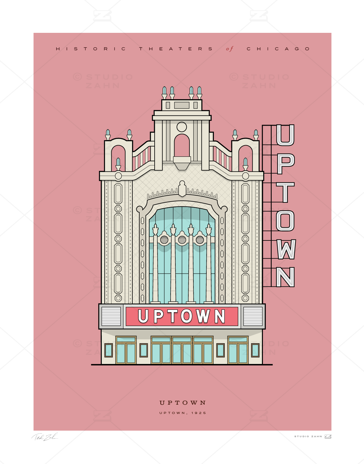 Art print of the Uptown Theater, opened in 1925 as a grand palace showcasing silent film and vaudeville, transitioning to a live music venue in the 1970s before shuttering in the 1980s. Currently under renovation to become a multi-purpose event center!