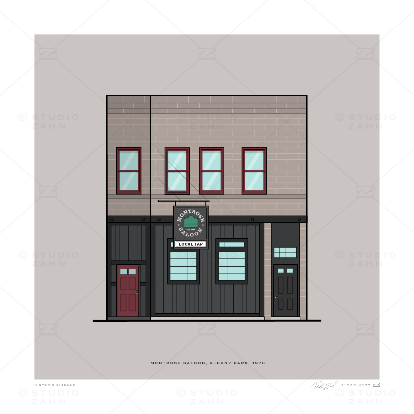 Art print of the Montrose Saloon, Albany Park's iconic corner tavern, beer garden and music venue since 1976.