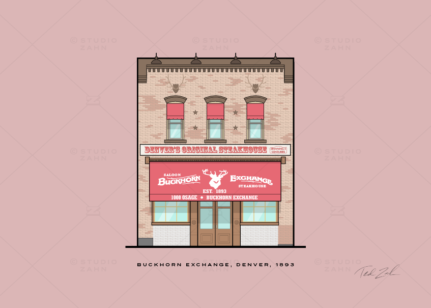 Art print of the Buckhorn Exchange, a Denver institution since 1893 ... member of the National Register of Historic Places, host to 5 presidents, and the city's oldest continuously-operating restaurant.