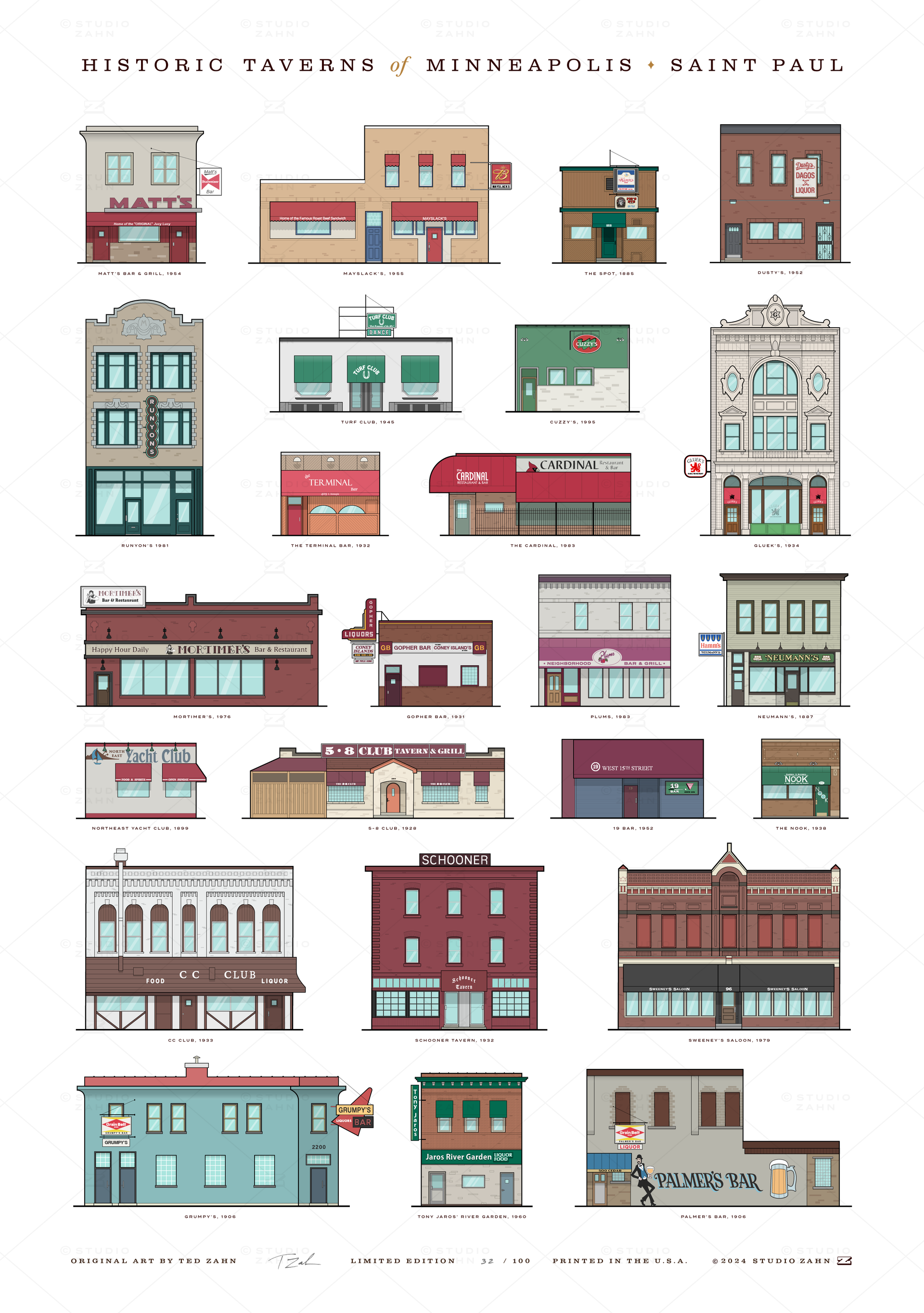 The rich tavern culture of Minnesota runs deep! This 19" x 27" poster celebrates 24 (A CASE!) of the Twin Cities longest-running, most iconic watering holes, including Gluek's, Sweeney's, Grumpy's, Matt's, The Spot, Palmer's, CC Club, The Nook, and as many more classics as I could possibly cram in here. Only 100 are printed ... each one will be hand-signed and numbered. Put some Northland history on your wall!