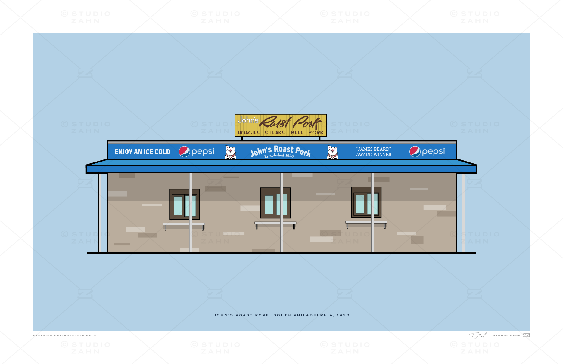 Art print of John's Roast Pork, the South Philly legend famous for thinly-sliced perfection on impeccable rolls for 90 years.