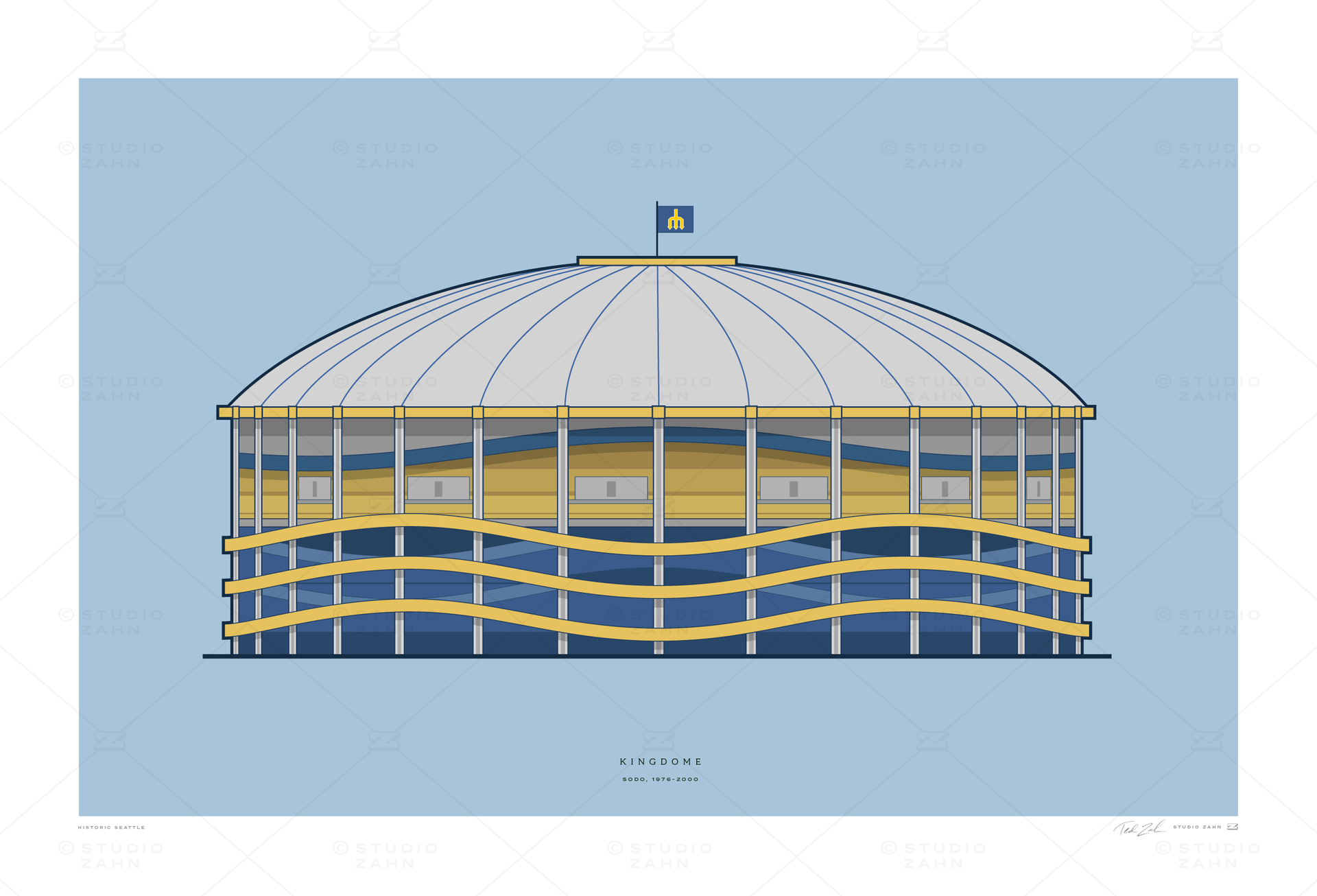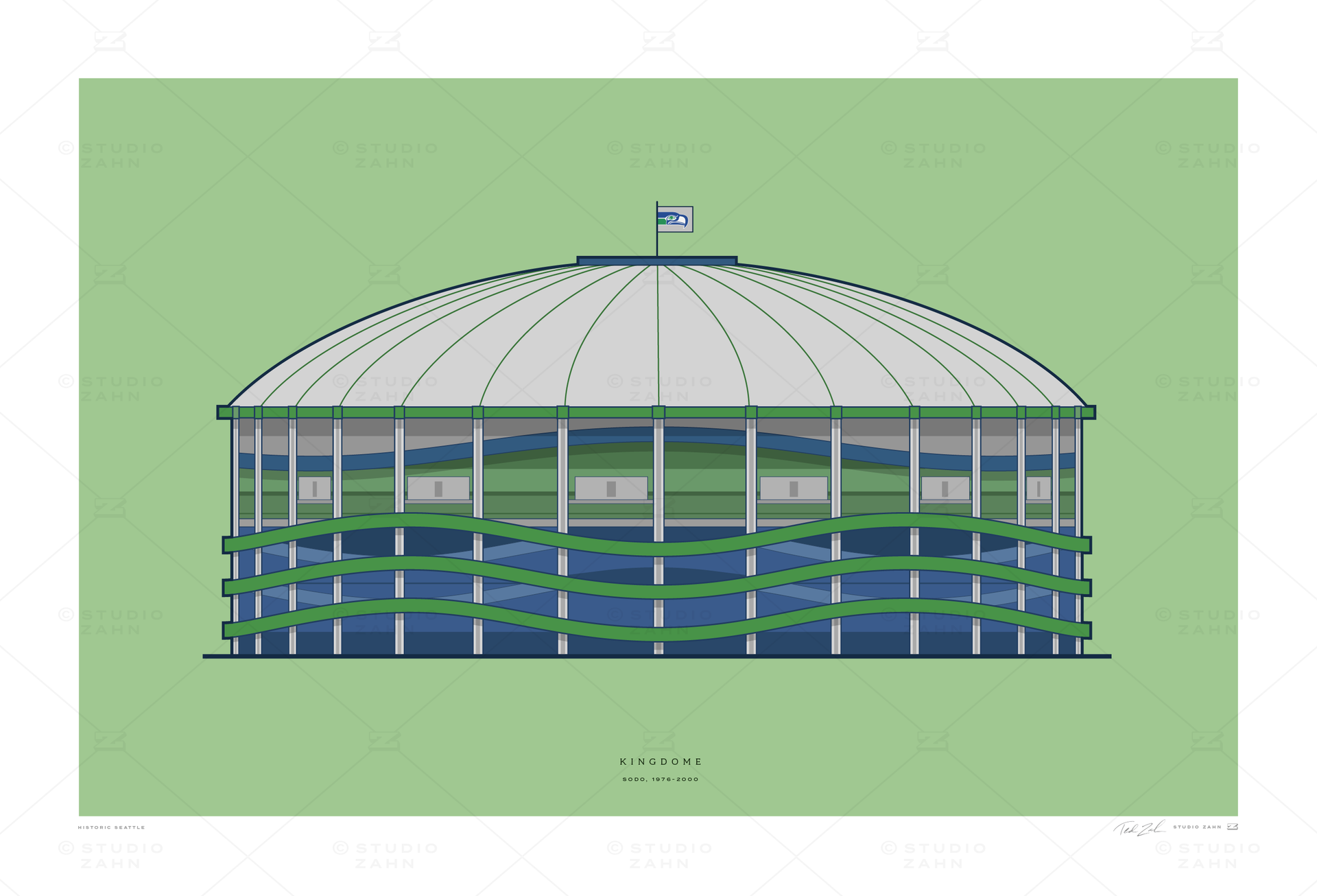 Art prints of Seattle's legendary venue The Kingdome, home of the Mariners and Seahawks from 1976-1999. 2 versions, specially designed using the original colors of both franchises — as worn by Largent, Zorn, Warner, Easley, Davis, Edgar, Buhner, Griffey and all the others who electrified this place for 25 years.