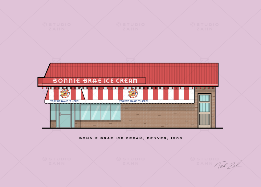 Art print of Bonnie Brae Ice Cream, the beloved BB neighborhood ice cream parlor dating to 1986 ... although the original shop and signage opened in 1945 as a Dolly Madison Dairy.