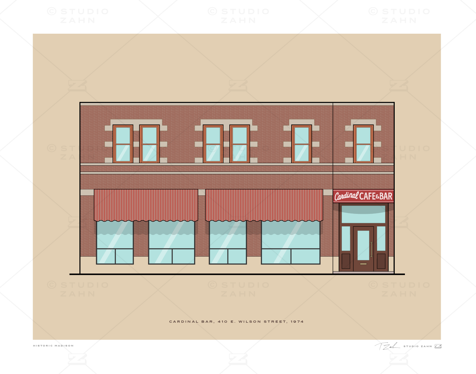 Art print of the Cardinal Bar, the iconic East Wilson bar and venue opened in 1974, closed, and then re-opened in 2023.
